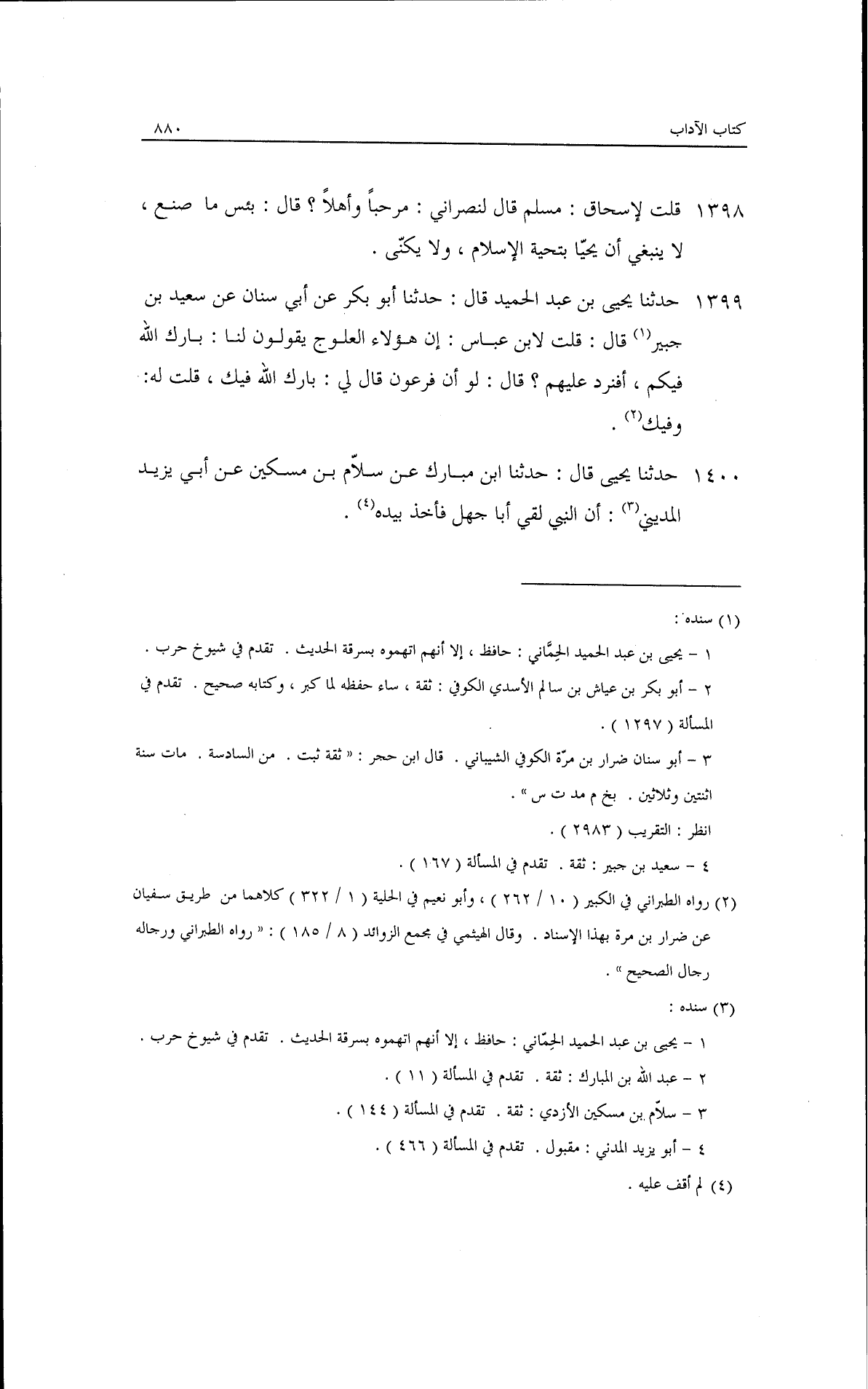 حدثنا يحيى بن عبد الحميد، قال: حدثنا أبو بكر، عن أبي سنان، عن سعيد بن جبير قال: قلت لابن عباس إن هؤلاء العلوج يقولون لنا: بارك الله فيكم أفنرد عليهم؟ قال: لو إن فرعون قال لي: بارك الله فيك. قلت له: وفيك.