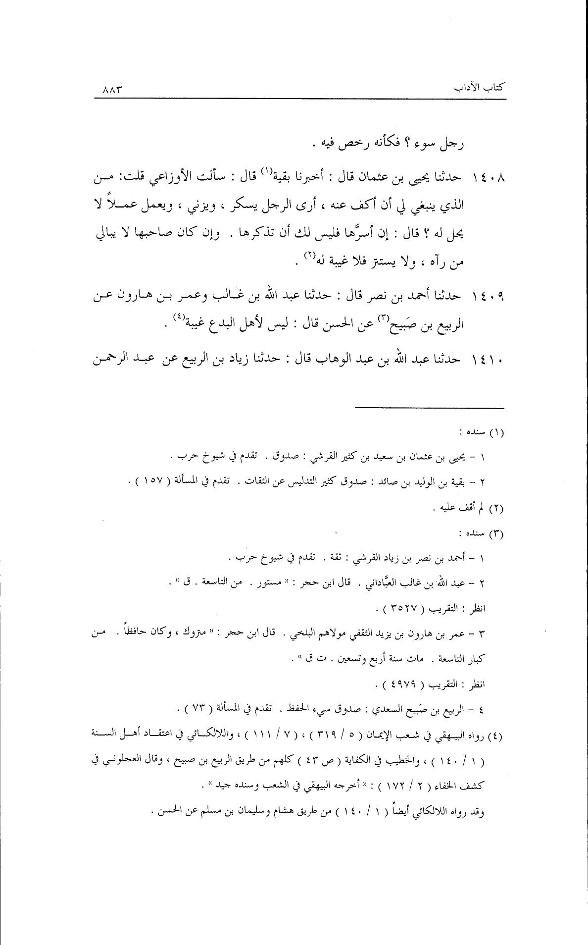 حدثنا يحيى بن عثمان قال: أخبرنا بقية قال: سألت الأوزاعي قلت: من الذي ينبغي لي أن أكف عنه أرى الرجل يسكر، ويزني، ويعمل عملًا لا يحل له؟ · قال: إن أسرها فليس لك أن تذكرها، وإن كان صاحبها لا يبالي من رآه ولا يستتر فلا غيبة له.