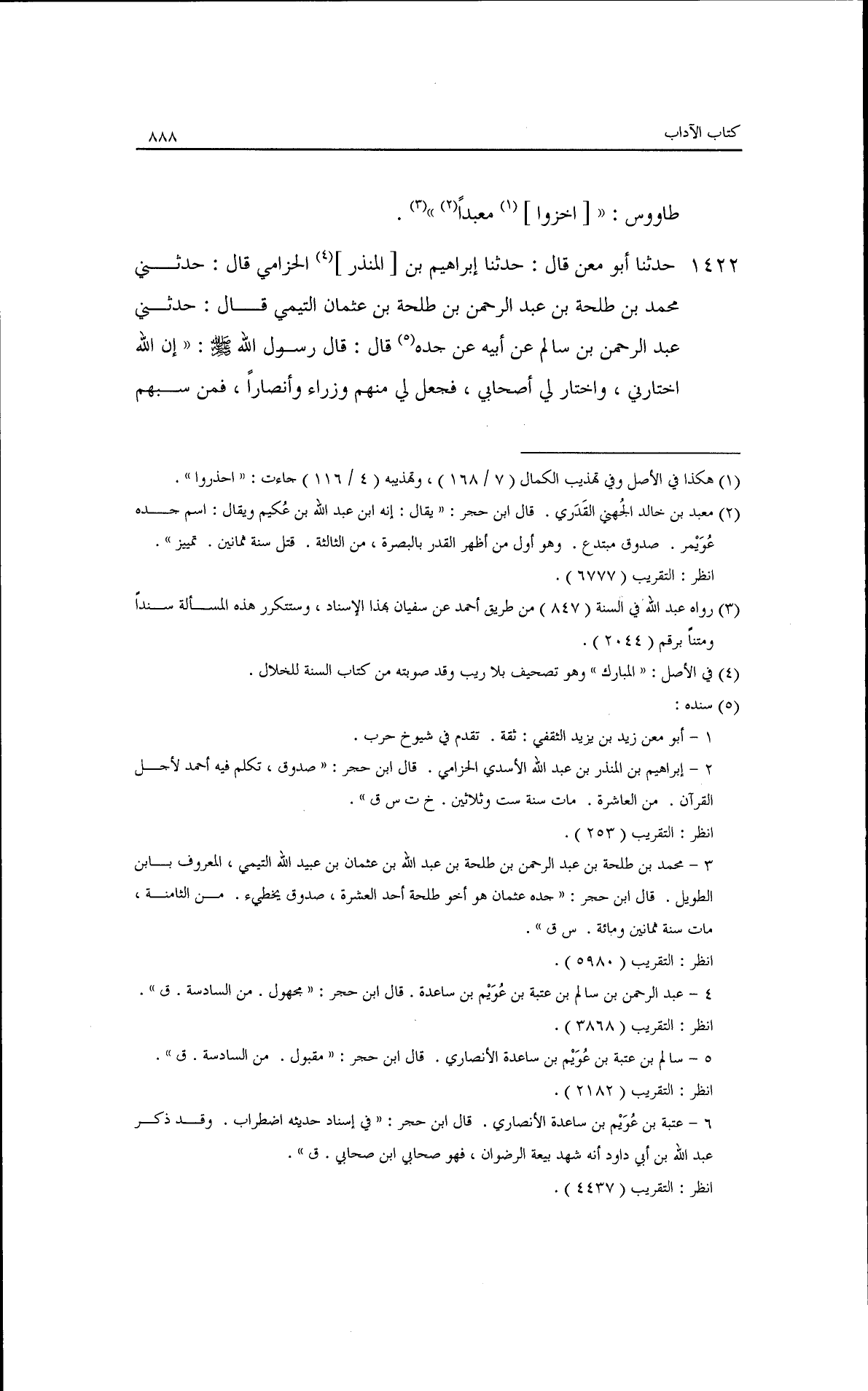 حدثنا أبو معن قال: حدثنا إبراهيم بن المبارك الخزامي قال: حدثني محمد ابن طلحة بن عبد الرحمن بن طلحة بن عثمان التيمي قال: حدثني عبد الرحمن بن سالم، عن أبيه، عن جده قال: قال رسول الله - صلى الله عليه وسلم -: ((إن الله اختارني واختار لي أصحابي، فجعل لي منهم وزراء وأنصارًا فمن سبهم