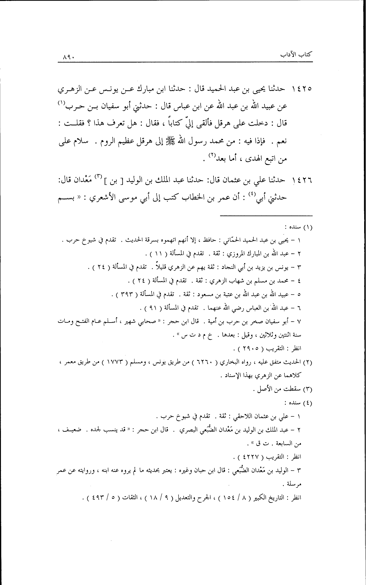 حدثنا يحيى بن عبد الحميد، قال: حدثنا ابن مبارك، عن يونس، عن الزهري، عن عبيد الله بن عبد الله، عن ابن عباس قال: حدثني أبو سفيان بن حرب قال: دخلت على هرقل قال: فألقى إلي كتابًا، فقال: هل تعرف هذا؟ فقلت: نعم· فإذا فيه: من محمد رسول الله - صلى الله عليه وسلم - إلى هرقل عظيم الروم سلام على من اتبع الهدى أما بعد.