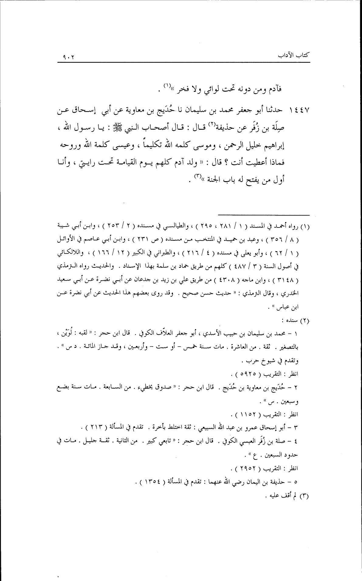 حدثنا أبو جعفر محمد بن سليمان، نا حديج بن معاوية، عن أبي إسحاق، عن صلة بن زفر، عن حذيفة قال: قال أصحاب النبي - صلى الله عليه وسلم - يا رسول الله إبراهيم خليل الرحمن وموسى كلمه الله تكليما، وعيسى كلمة الله وروحه فماذا أعطيت أنت؟ قال: ((ولد آدم كلهم يوم القيامة تحت رايتي، وأنا أول من يفتح له باب: الجنة)).
