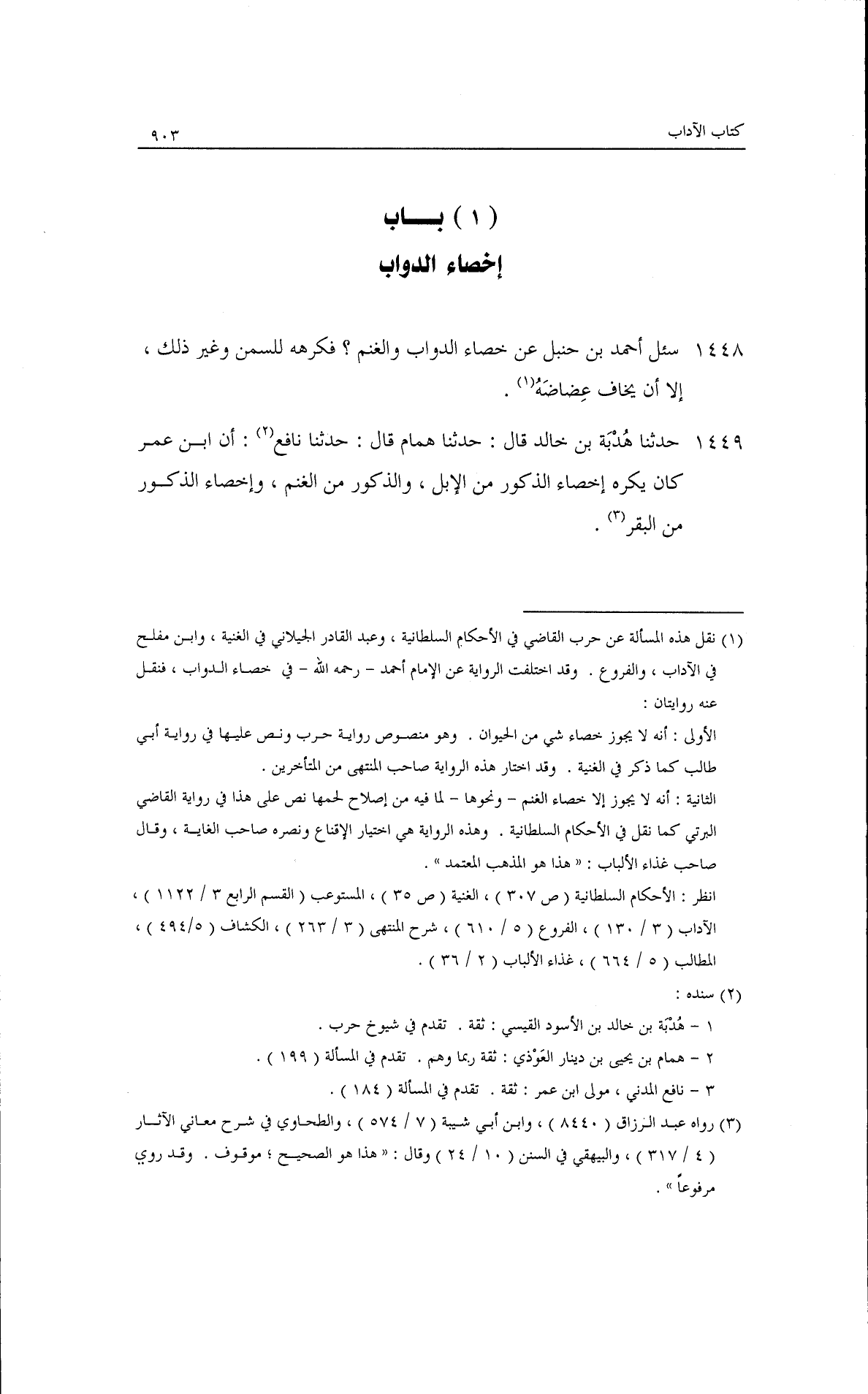 سُئلَ أحمد بن حنبل، عن إخصاء الدواب والغنم فكره للسمن وغير ذلك، إلا أن يخاف عضاضه. حدثنا هدبة بن خالد، قال: حدثنا همام، قال: حدثنا نافع أن ابن عمر كان يكره إخصاء الذكور من الإبل، والذكور من الغنم، وإخصاء الذكور من البقر.
