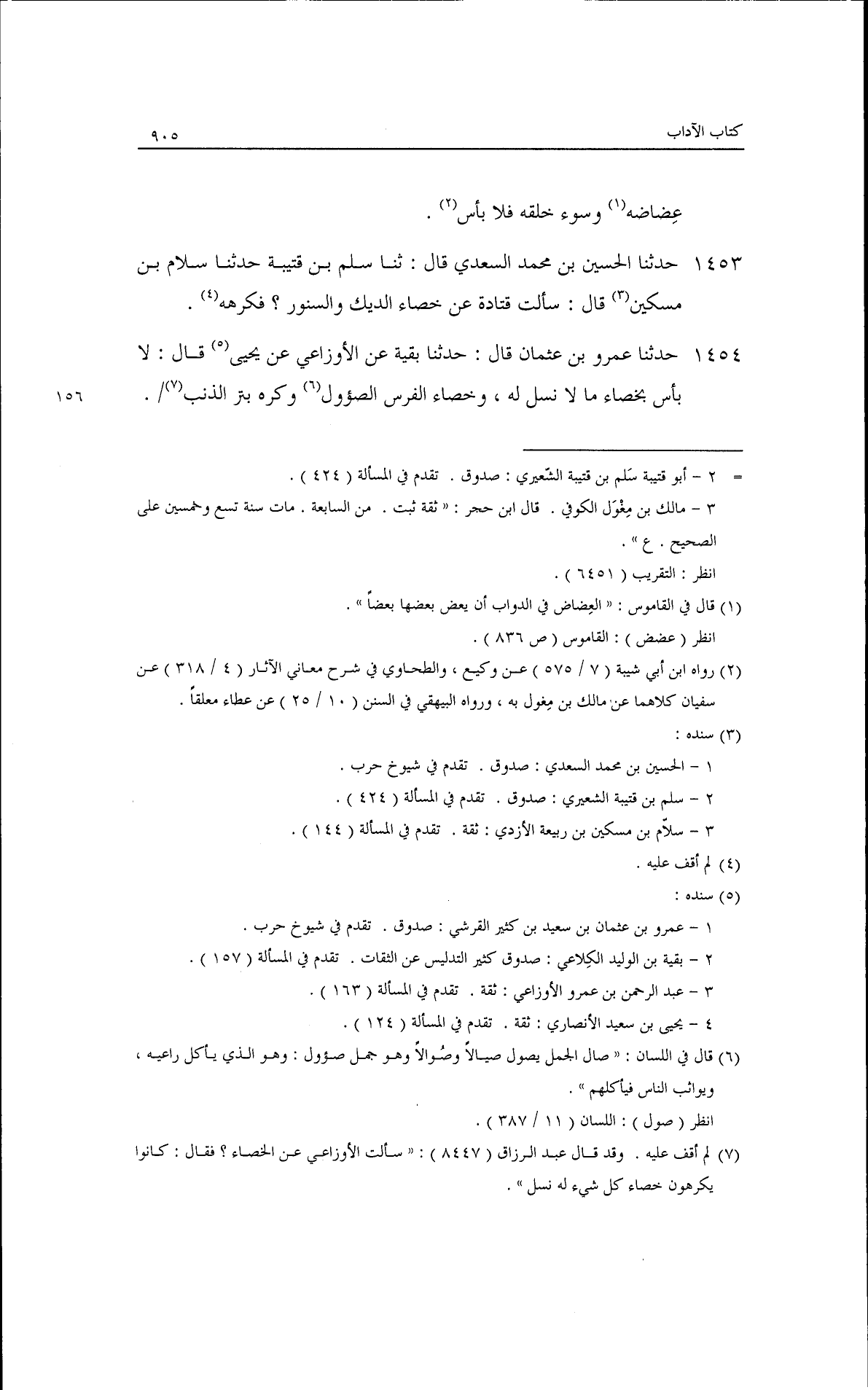 حدثنا عمرو بن عثمان، قال: حدثنا بقية، عن الأوزاعي، عن يحيى قال: لا بأس بخصاء ما لا نسل له، وخصاء الفرس الصوول، وكذا بتر الذنب. /151/