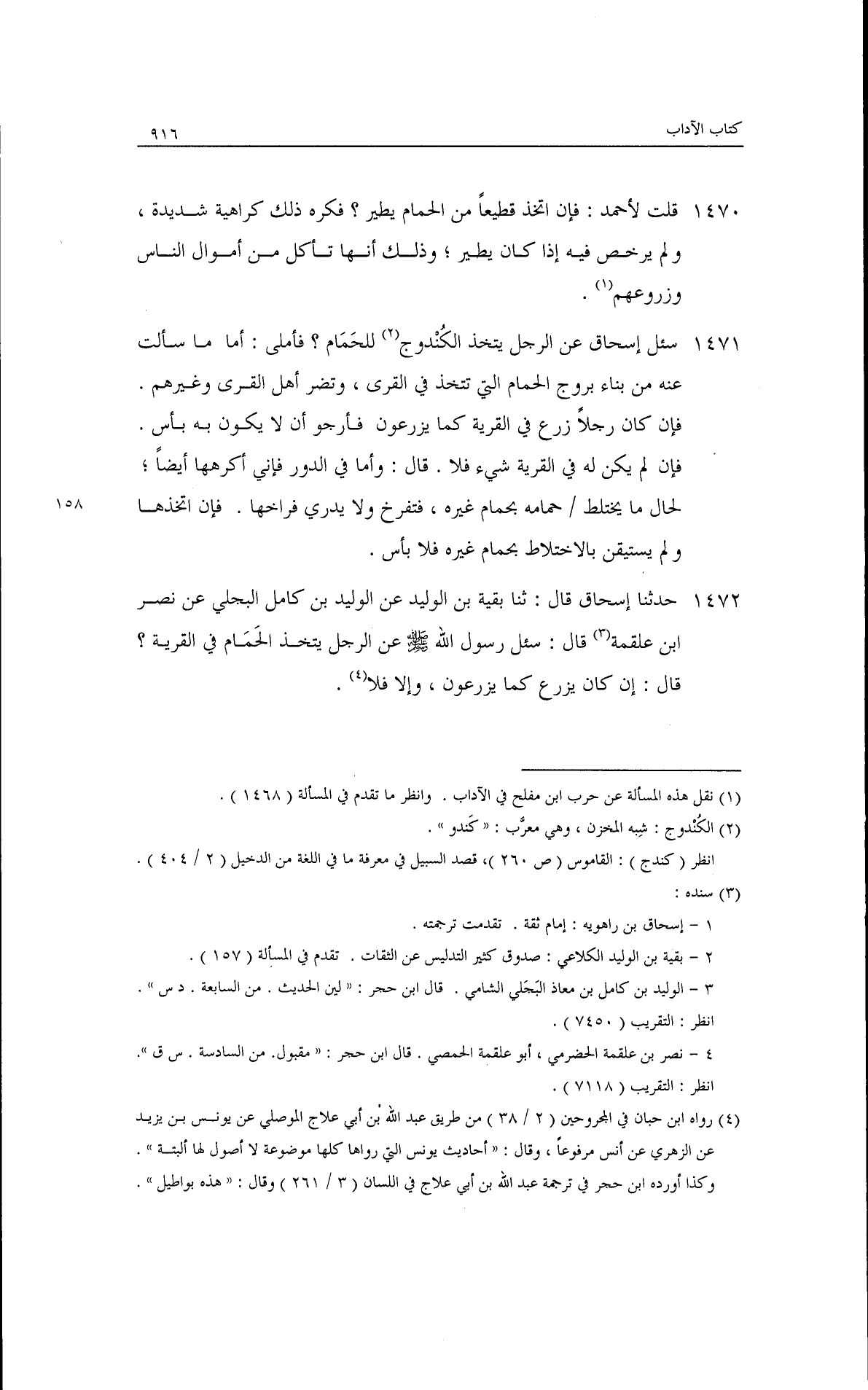 سُئلَ إسحاق عن الرجل يتخذ الكندوج للحمام؟ فأملى: أما سألت عنه من بناء بروج الحمام التي تتخذ في القرى وتضر أهل القرى وغيرهم فإن كان رجلًا زرع في القرية كما يزرعون فأرجوا إلا يكون به بأس، فإن لم يكن له في القرية شيء فلا. قال: وأما في الدور فإني أكرهها أيضًا بحال ما تختلط/153/حمامه بحمام غيره فتفرخ ولا يدري فراخها، فإن اتخذها ولم يستيقن بالاختلاط بحمام غيره فلا بأس. حدثنا إسحاق، قال: ثنا بقية بن الوليد، عن الوليد بن كامل البجلي، عن نصر بن علقمة قال: سُئلَ رسول الله - صلى الله عليه وسلم - عن الرجل يتخذ الحمام في القرية قال: ((إن كان يزرع كما يزرعون، وإلا فلا)).