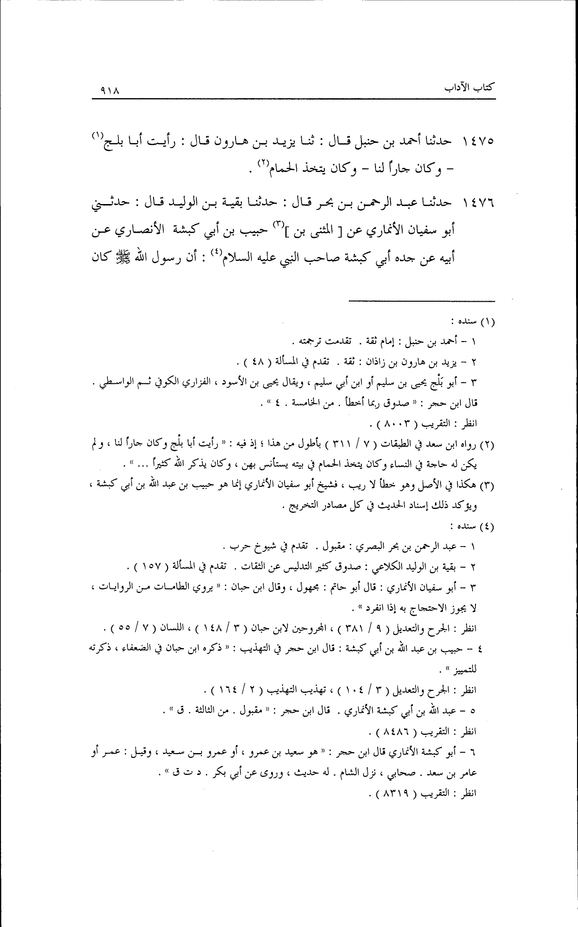 حدثنا عبد الرحمن بن بحر قال: حدثنا بقية بن الوليد قال: حدثني أبو سفيان الأنباري، عن المثنى بن حبيب بن أبي كبشة الأنباري، عن أبيه، عن جده أبي كبشة صاحب النبي عليه السلام إن رسول الله - صلى الله عليه وسلم - كان