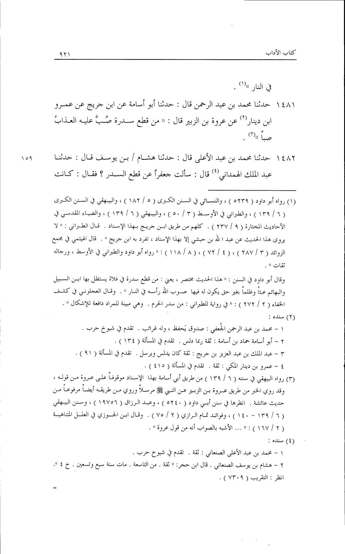 حدثنا محمد بن عبد الرحمن قال: حدثنا أبو أسامة، عن ابن جريج، عن عمرو بن دينار، عن عروة بن الزبير قال: من قطع سدرة صُبَّ عليه العذاب صبًّا.