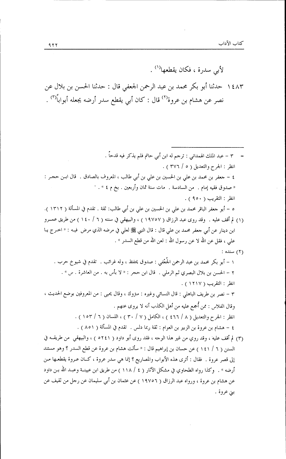 حدثنا أبو بكر محمد بن عبد الرحمن الجعفي قال: حدثنا الحسن بن بلال، عن نصر، عن هشام بن عروة قال: كان أبي يقطع سدر أرضه يجعلها أبوابًا.