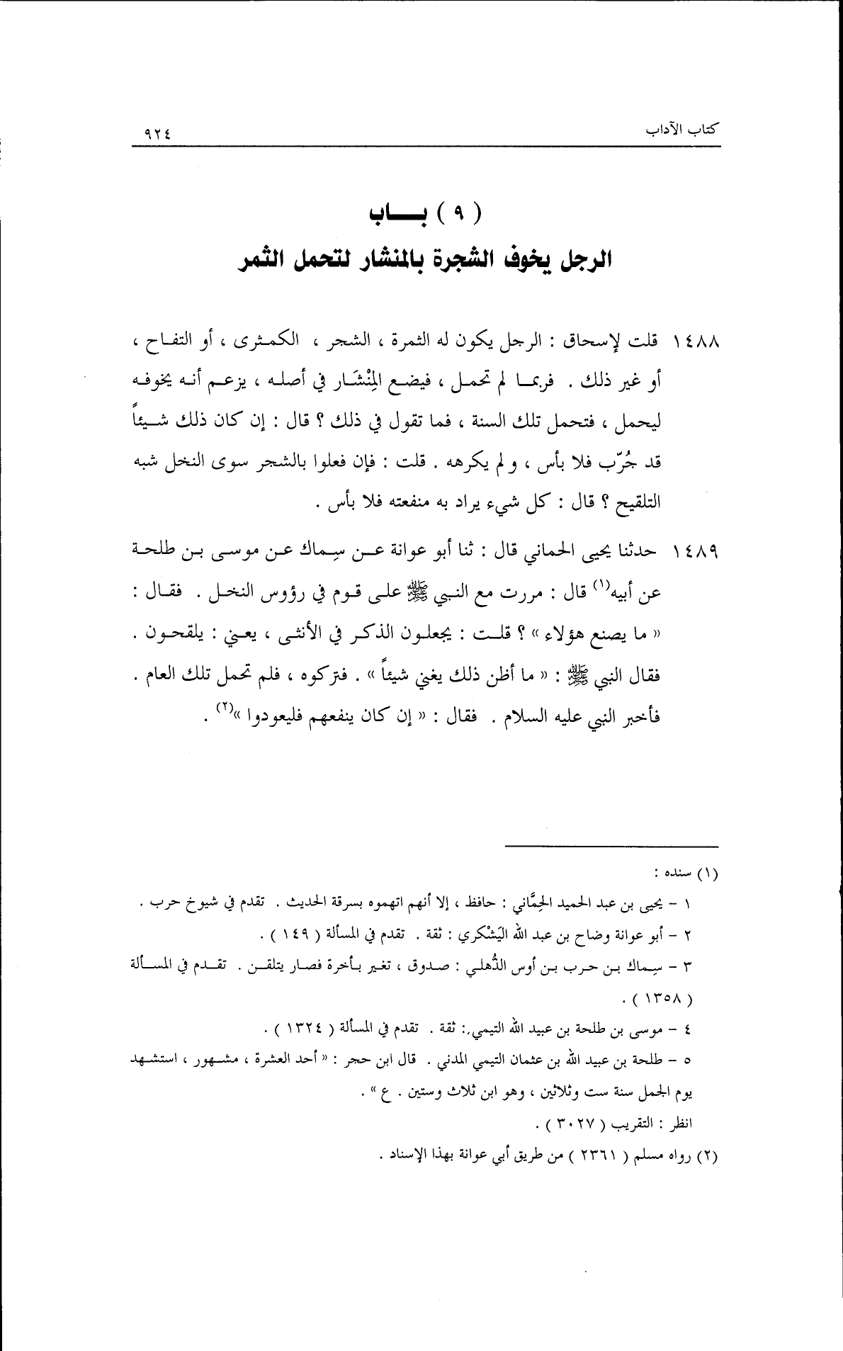 حدثنا يحيى الحماني، قال: ثنا أبو عوانة، عن شمال، عن موسى بن طلحة، عن أبيه قال: مررت مع النبي - صلى الله عليه وسلم - على قوم في رءوس النخل فقال: ((ما يصنع هؤلاء؟)) · قلت: يجعلون الذكر في الأنثى - يعني: يلقحون -· فقال النبي - صلى الله عليه وسلم -: ((ما أظن ذلك يعني شيئًا)) فتركوه فلم يحمل تلك العام، فأُخبر بذلك النبي عليه السلام فقال: ((إن كان ينفعهم فليعودوا)).