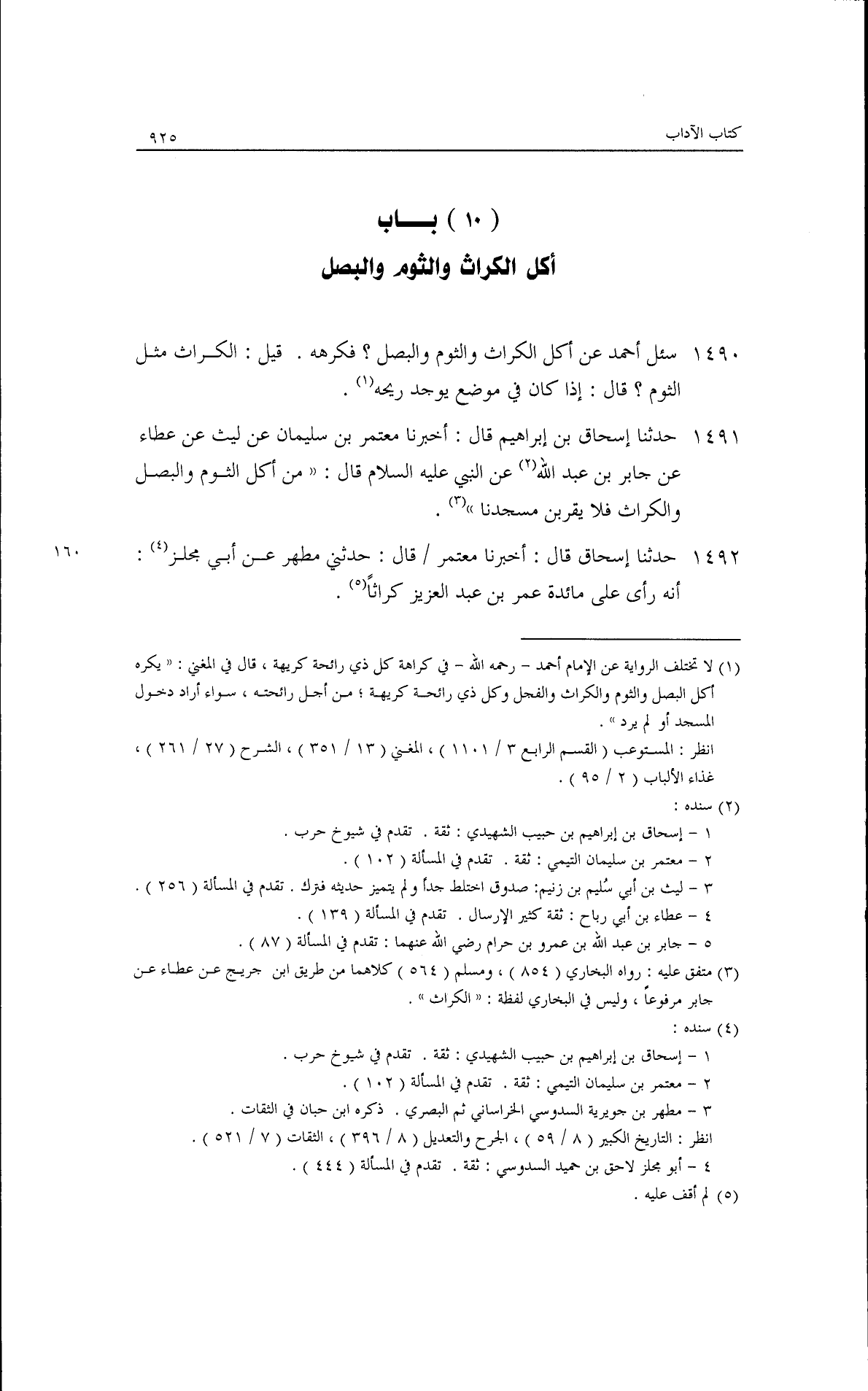 حدثنا إسحاق بن إبراهيم، قال: أخبرنا معتمر بن سليمان، عن ليث، عن عطاء، عن جابر بن عبد الله، عن النبي عليه السلام قال: ((من أكل الثوم والبصل والكراث فلا يقربن مسجدنا)).