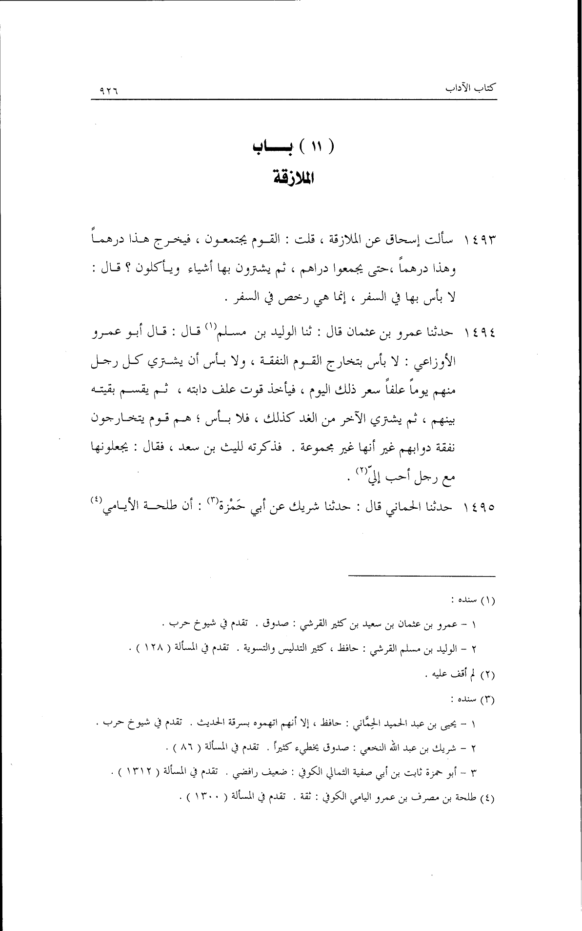 سألت إسحاق عن الملازقة، قلت: القوم يجتمعون فيخرج هذا درهمًا وهذا درهمًا حتى يجمعوا دراهم ثم يشترون بها شيئًا ويأكلون؟ قال: لا بأس بها في السفر، إنما هي رخص في السفر.