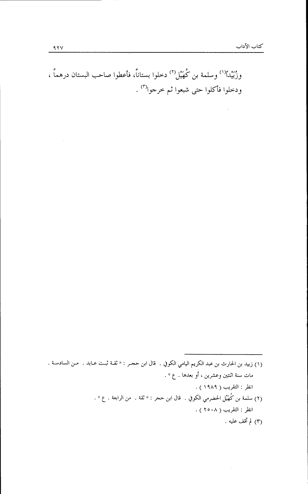 وزبيدًا وسلمة بن كهيل دخلوا بستانًا فأعطوا صاحب البستان درهمًا ودخلوا فأكلوا حتى شبعوا، ثم خرجوا