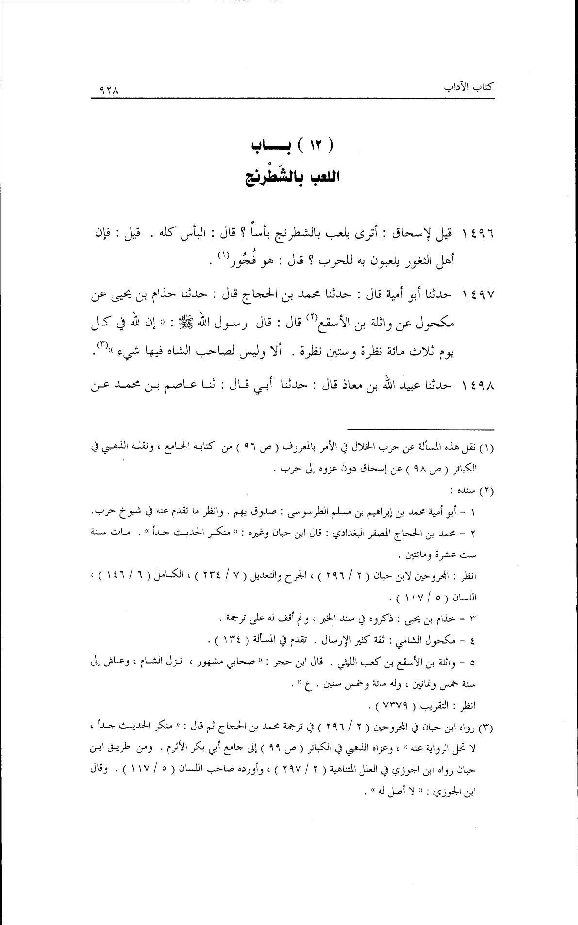 للعب بالشطرنج. قيل لإسحاق: أترى بلعب الشطرنج بأسًا؟ قال: البأس كله. قيل: فإن أهل الثغور يلعبون به للحرب؟ قال هو فجور.