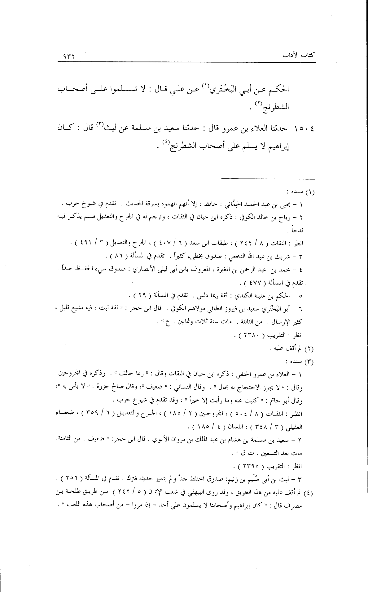 الحكم، عن أبي البختري، عن علي قال: لا تسلموا على أصحاب الشطرنج.