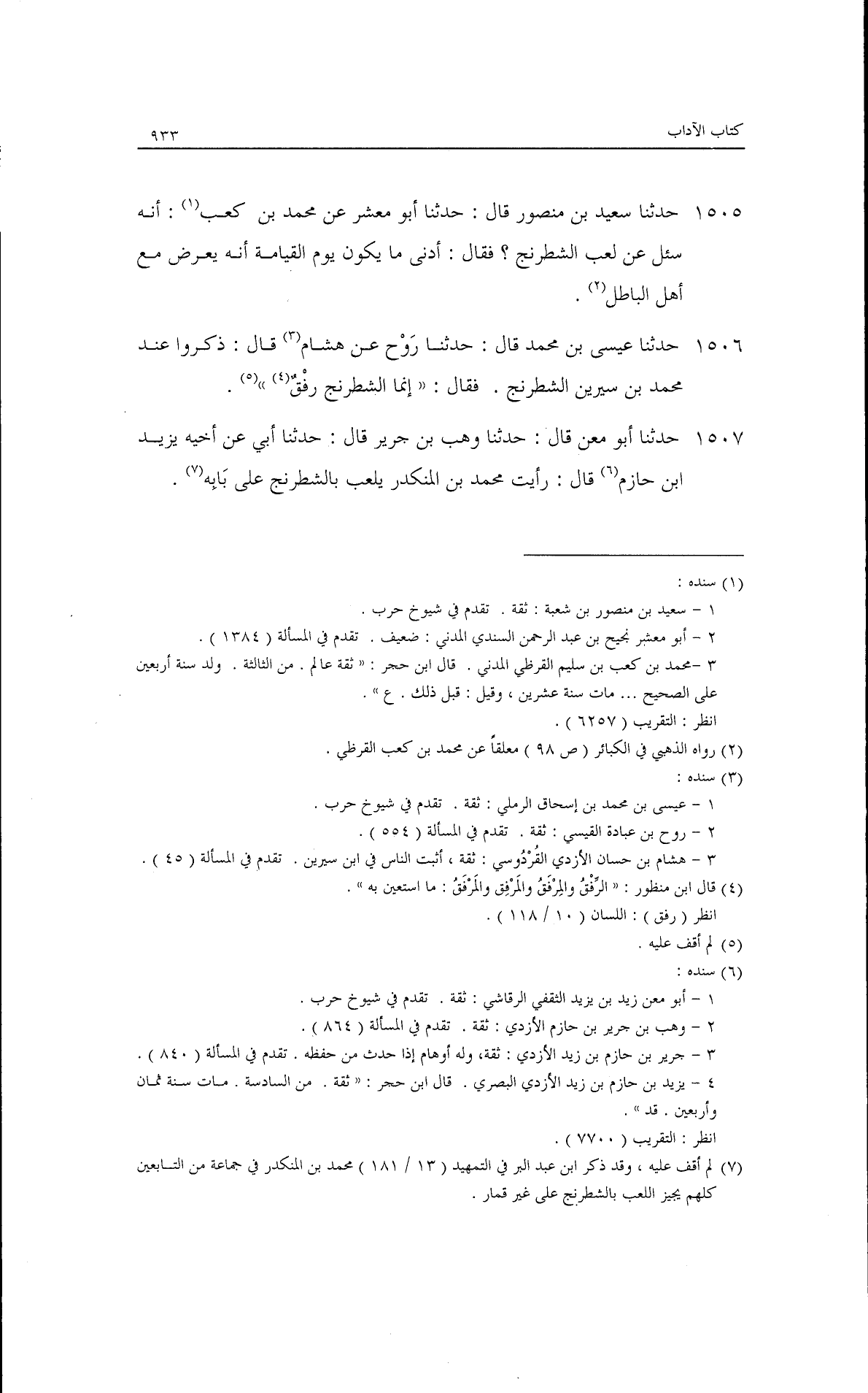 حدثنا أبو معن قال: حدثنا وهب بن جرير قال: حدثنا أبي، عن أخيه يزيد بن حازم قال: رأيت محمد بن المنكدر يلعب بالشطرنج على باب: هـ.
