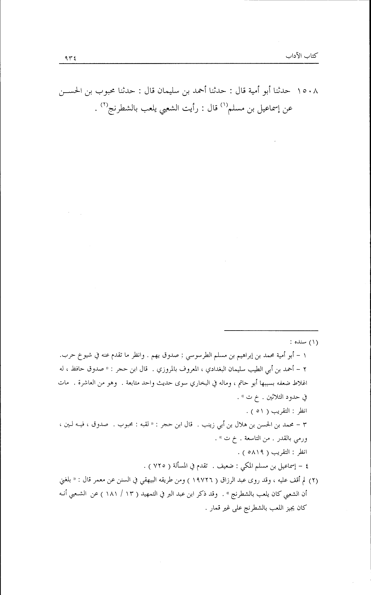 حدثنا أبو أمية قال: حدثنا أحمد بن سليمان قال: حدثنا محبوب بن الحسن، عن إسماعيل بن مسلم قال: رأيت الشعبي يلعب بالشطرنج.