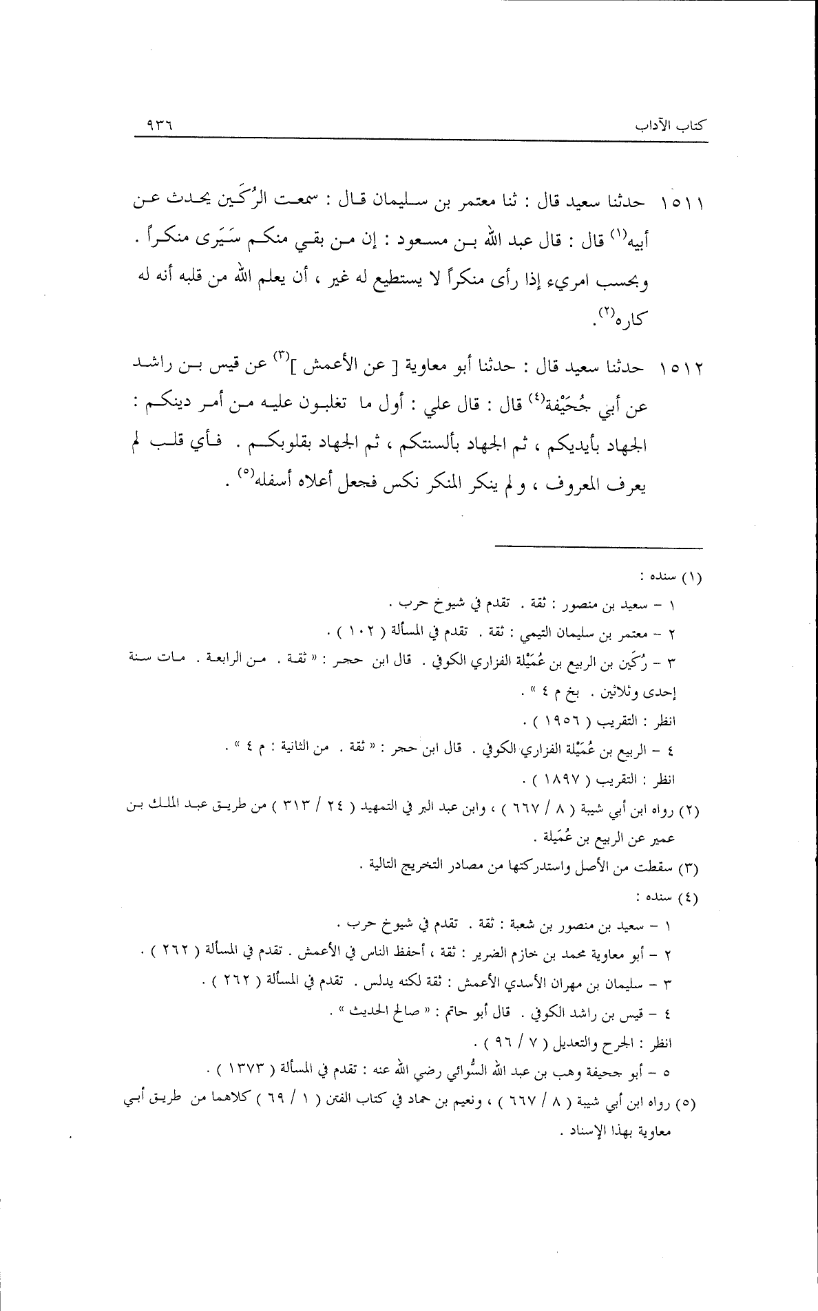 حدثنا سعيد، قال: حدثنا أبو معاوية، عن الأعمش، عن قيس بن راشد، عن أبي جحيفة قال: قال علي أول ما تغلبون عليه من أمر دينكم الجهاد بأيديكم، ثم الجهاد بألسنتكم، ثم الجهاد بقلوبكم، فأي قلب لم يعرف المعروف ولم ينكر المنكر نكس فجعل أعلاه أسفله.