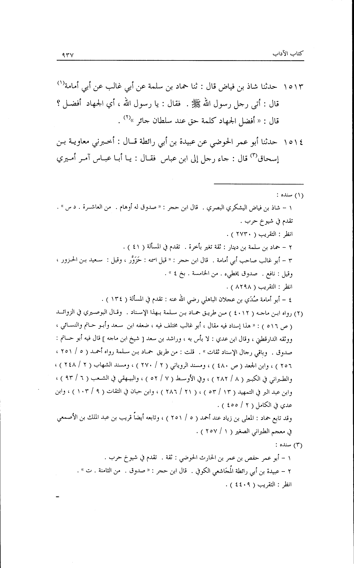 حدثنا شاذ بن فياض، قال: ثنا حماد بن سلمة، عن أبي غالب، عن أبي أمامة، قال: أتى رجل رسول الله صلى اله عليه وسلم فقال: يا رسول الله أي الجهاد أفضل؟ قال: ((أفضل الجهاد كلمة حق عند سلطان جائر)).