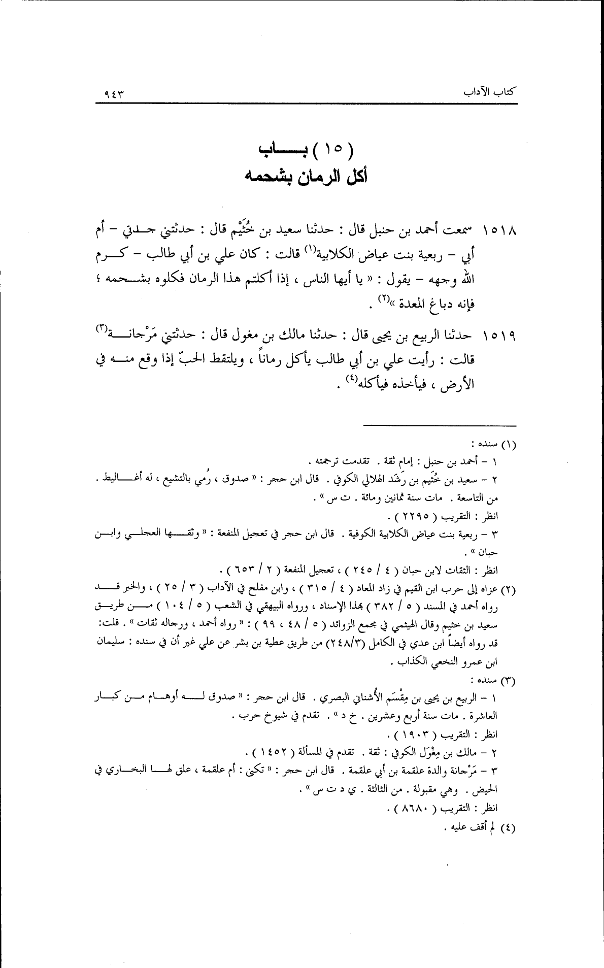 سمعت أحمد بن حنبل، قال: حدثنا سعيد بن خثيم، قال: حدثتني جدتي أم أبي ربيعة بنت عياض الكلابية قالت: كان علي بن أبي طالب - كرم الله وجهه -يقول: يا أيها الناس إذا أكلتم هذا الرمان فكلوه بشحمه فأنه دباغ المعدة. حدثنا الربيع بن يحيى قال: حدثنا مالك بن مغول قال: حدثتني مرجانة قالت: رأيت علي بن أبي طالب يأكل رمانًا ويلتقط الحب إذا وقع منه في الأرض فيأخذه فيأكله.
