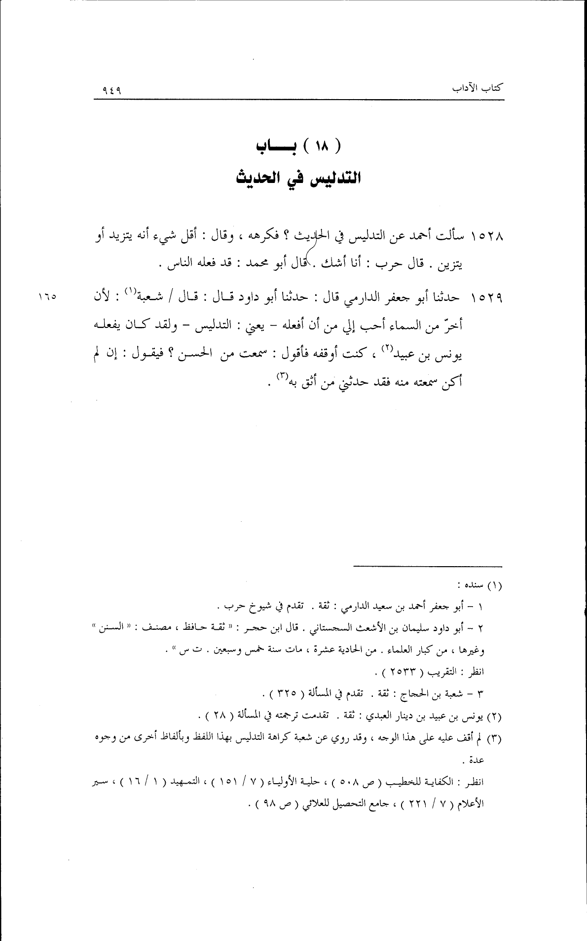 سألتُ أحمد عن التدليس في الحديث فكرهه وقال: أقل شيء أنه يتزيد أو يتزين. قال حرب: أنا أشك. قال أبو محمد: قد فعله الناس.