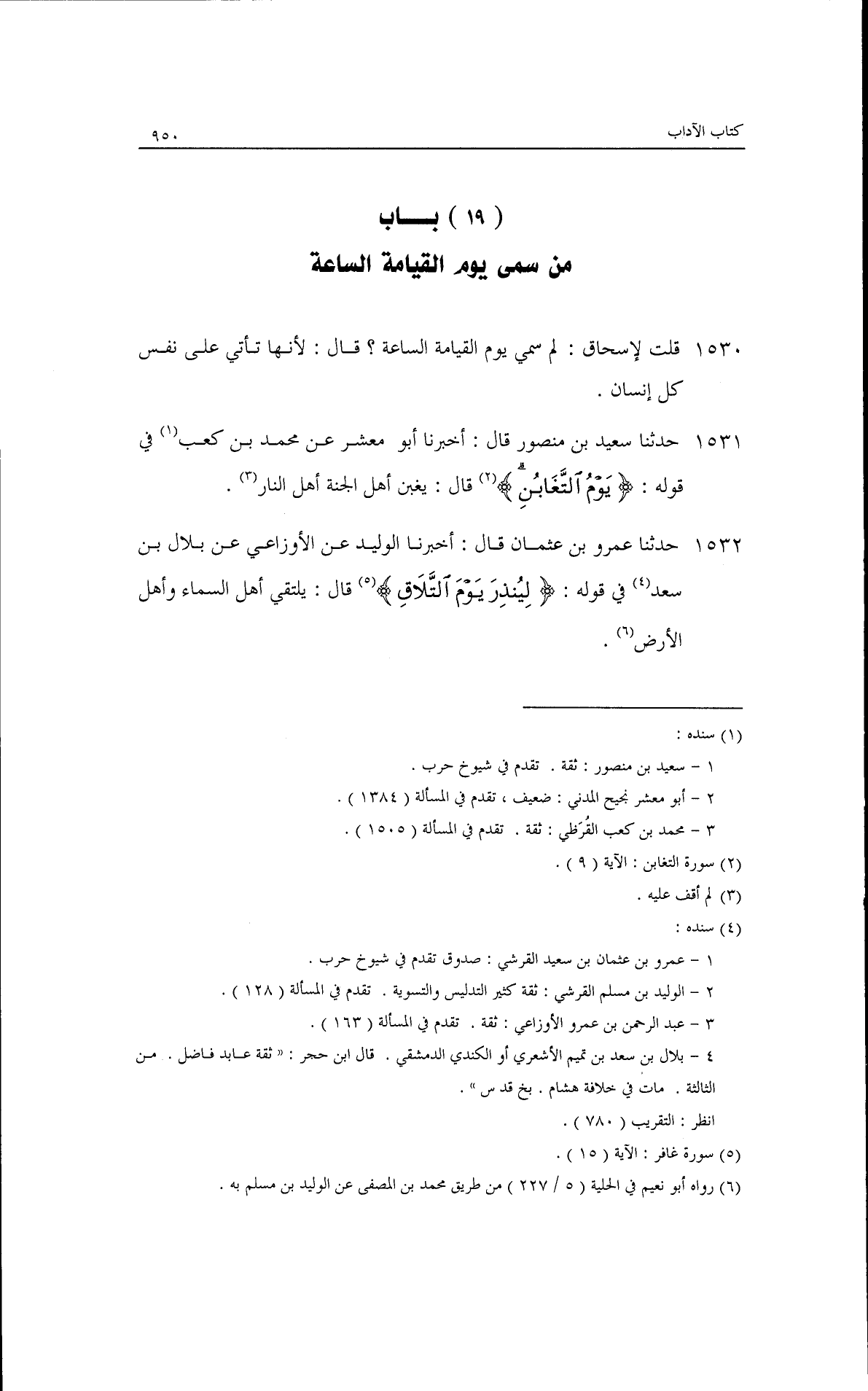 قلت لإسحاق: لم سمي يوم القيامة الساعة؟ قال: لأنها تأتي على نفس كل إنسان. حدثنا سعيد بن منصور قال: أخبرنا أبو معشر، عن محمد بن كعب في قوله: {يَوْمُ التَّغَابُنِ} [التغابن: 9]. قال: يوم القيامة تغبن أهل الجنة أهل النار.