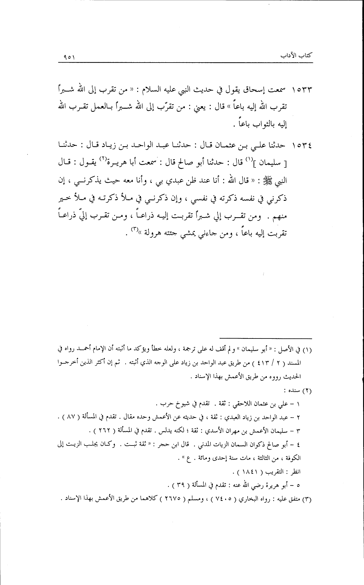 حدثنا علي بن عثمان قال: حدثنا عبد الواحد بن زياد قال: حدثنا أبو سليمان قال: حدثنا أبو صالح قال: سمعت أبا هريرة يقول: قال النبي - صلى الله عليه وسلم - ((قال الله: أنا عند ظن عبدي بي، وأنا معه حيث يذكرني إن ذكرني في نفسه ذكرته في نفسي وإن ذكرني في ملأٍ ذكرته في ملأٍ خير منهم، ومن تقرب إليَّ شبرًا تقربت إليه ذراعًا ومن تقرب إليَّ ذراعًا تقربت إليه باعًا، ومن جاءني يمشي جئته هرولة)).