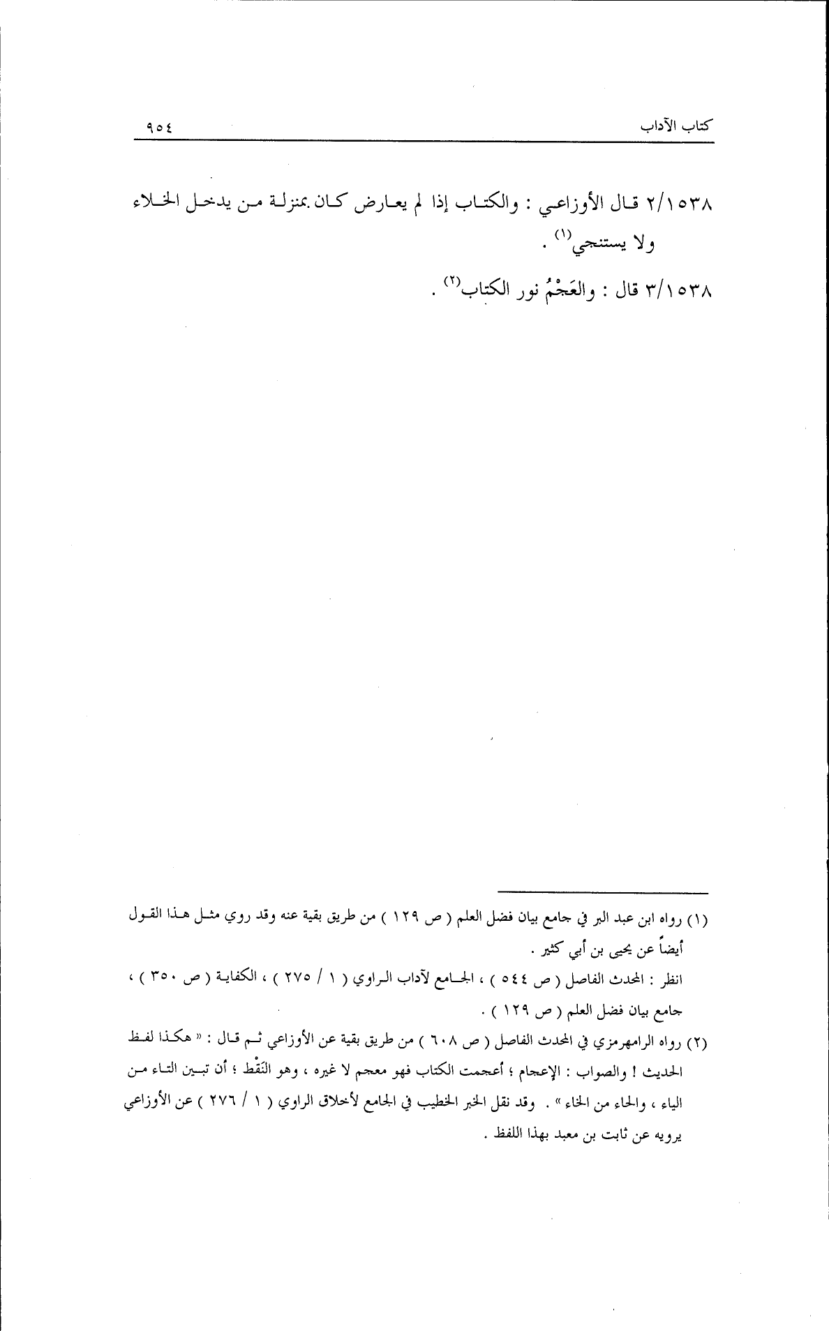 قال الأوزاعي: والكتاب إذا لم يُعارض كان بمنزلة من يدخل الخلاء ولا يستنجي. قال: والعجم نور الكتاب.