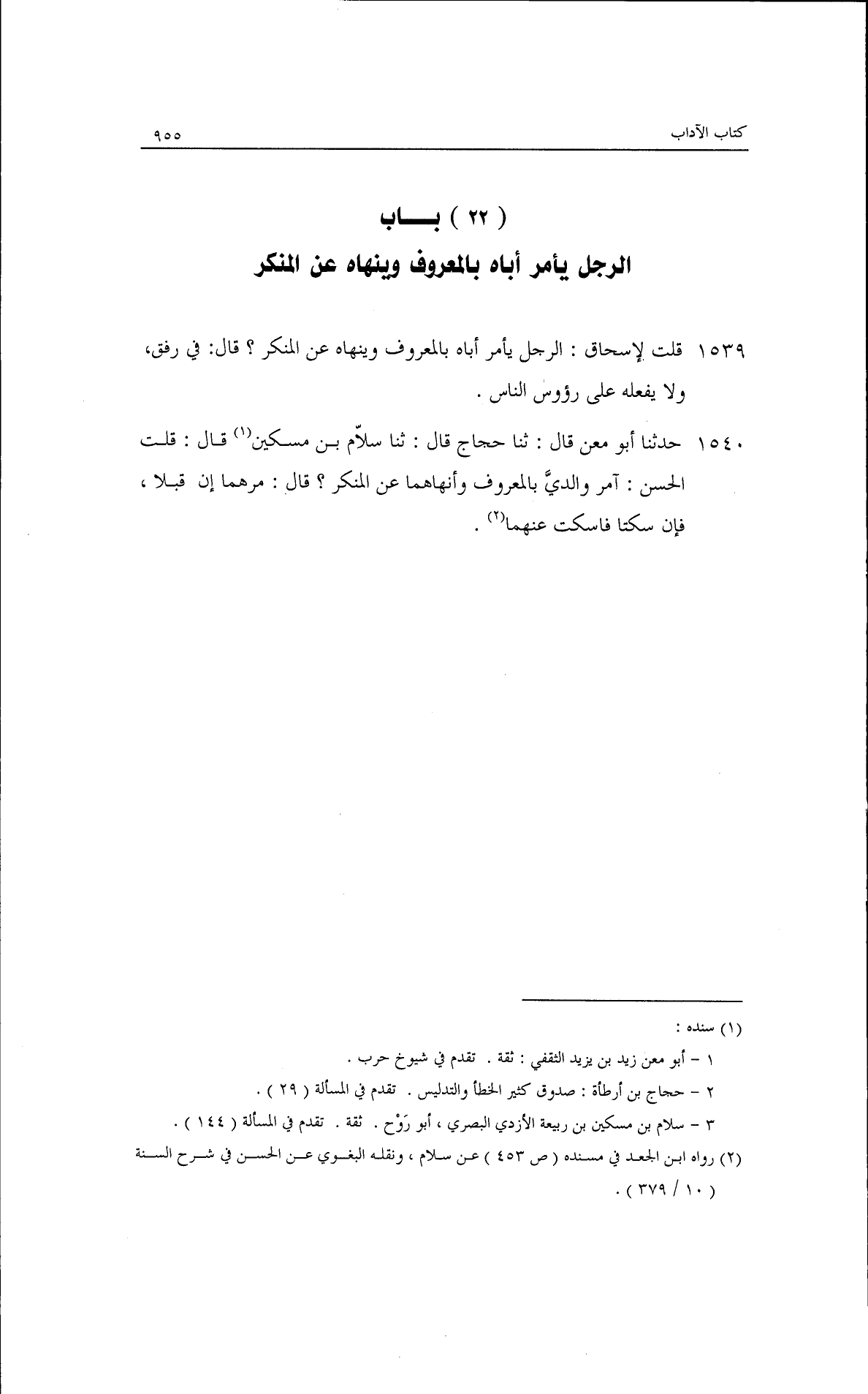 حدثنا أبو معن قال: ثنا حجاج قال: ثنا سلام بن مسكين قال: قلت للحسن: آمر والديَّ بالمعروف وأنهاهما عن المنكر؟ قال: مرهما إن قبلا، فإن سكتا فاسكت عنهما.