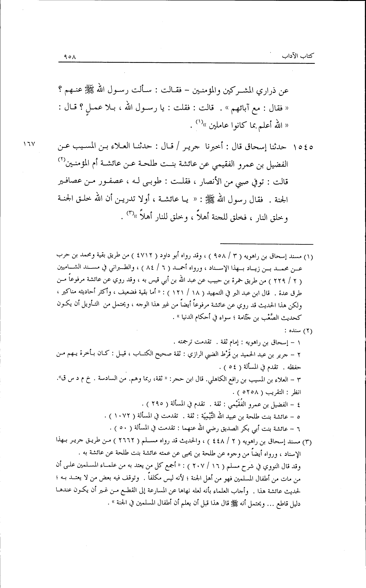عن دراري المشركين والمؤمنين فقالت سألتُ رسول الله - صلى الله عليه وسلم - عنهم فقال: ((مع آبائهم)). قالت: فقلت: يارسول الله بلا عمل؟ قال: ((الله أعلم بما كانوا عاملين)).