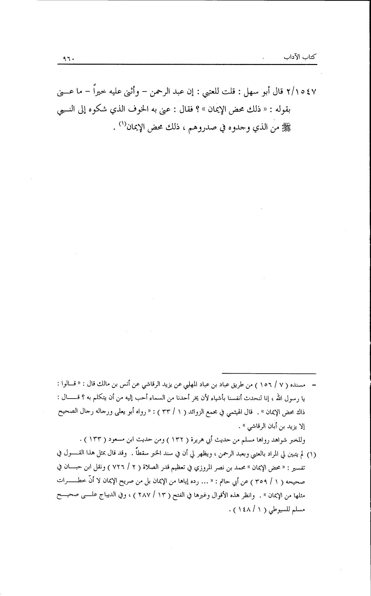 قال أبو سهل: قلت للعتبي: إن عبد الرحمن وأثنا عليه خيرًا ما عنى بقوله ذلك محض الإيمان؟ فقال: عنى به الخوف الذي شكوه إلى النبي - صلى الله عليه وسلم - من الذي وجدوه في صدورهم ذلك محض الإيمان.