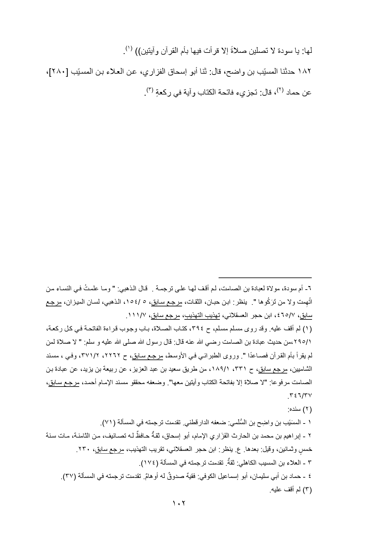 (¬1) لم أقف عليه. وقد روى مسلم مسلم، ح 394، كتاب الصلاة، باب وجوب قراءة الفاتحة في كل ركعة، 1/ 295،من حديث عبادة بن الصامت رضي الله عنه قال: قال رسول الله صلى الله عليه وسلم: " لا صلاة لمن لم يقرأ بأم القرآن فصاعدًا ". وروى الطبراني في الأوسط، مرجع سابق، ح 2262، 2/ 371، وفي، مسند الشاميين، مرجع سابق، ح 331، 1/ 189، من طريق سعيد بن عبد العزيز، عن ربيعة بن يزيد، عن عبادة بن الصامت مرفوعا: "لا صلاة إلا بفاتحة الكتاب وآيتين معها". وضعفه محققو مسند الإمام أحمد، مرجع سابق، 37/ 346.