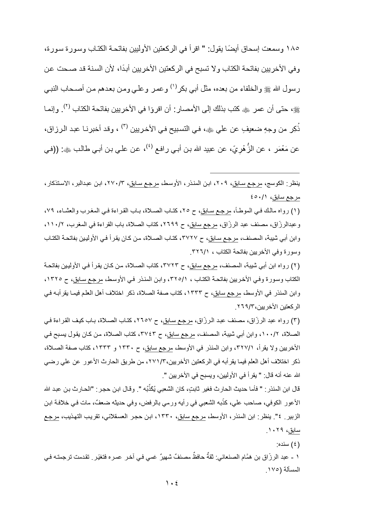 (¬2) رواه ابن أبي شيبة، المصنف، مرجع سابق، ح 3723، كتاب الصلاة، من كان يقرأ في الأوليين بفاتحة الكتاب وسورة وفي الأخريين بفاتحة الكتاب، 1/ 325، وابن المنذر في الأوسط، مرجع سابق، ح 1325، وابن المنذر في الأوسط، مرجع سابق، ح 1333، كتاب صفة الصلاة، ذكر اختلاف أهل العلم فيما يقرأبه في الركعتين الأخريين،3/ 269.