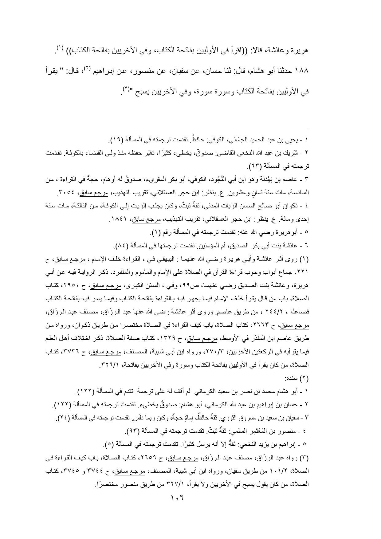 (¬3) رواه عبد الرزّاق، مصنف عبد الرزّاق، مرجع سابق، ح 2659، كتاب الصلاة، باب كيف القراءة في الصلاة، 2/ 101 من طريق سفيان، ورواه ابن أبي شيبة، المصنف، مرجع سابق، ح 3744 و 3745، كتاب الصلاة، من كان يقول يسبح في الأخريين ولا يقرأ، 1/ 327 من طريق منصور مختصرًا.
