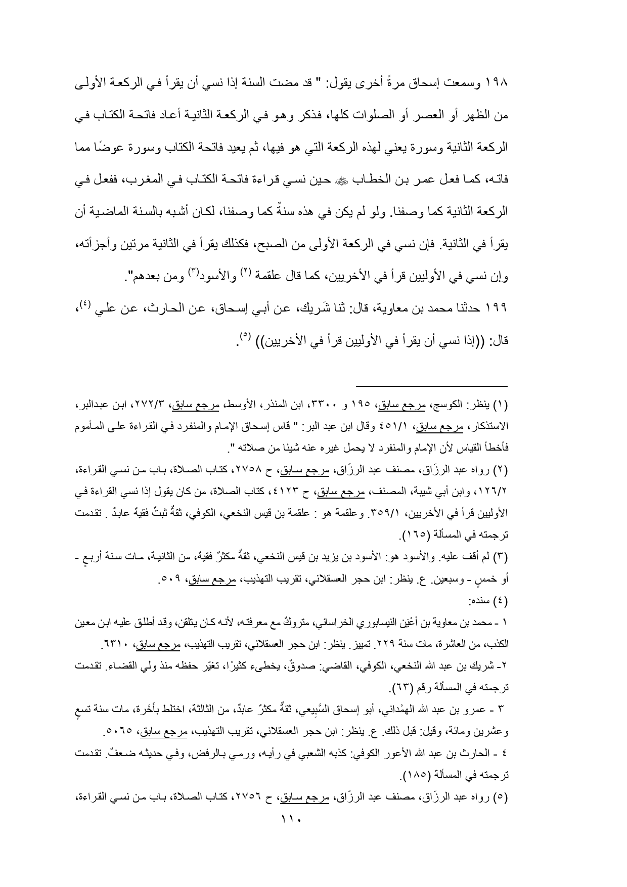 (¬4) رواه عبد الرزّاق، مصنف عبد الرزّاق، مرجع سابق، ح 2756، كتاب الصلاة، باب من نسي القراءة، 2/ 125، من طريق أبي إسحاق.