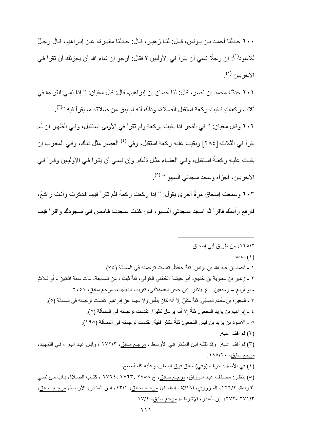 (¬5) ينظر: مصنف عبد الرزّاق، مرجع سابق، ح 2758 ,2763 ,2764، كتاب الصلاة، باب من نسي القراءة، 2/ 126، المروزي، اختلاف العلماء، مرجع سابق، 1/ 43، ابن المنذر، الأوسط، مرجع سابق، 3/ 271 - 272، ابن المنذر، الإشراف، مرجع سابق، 2/ 17.