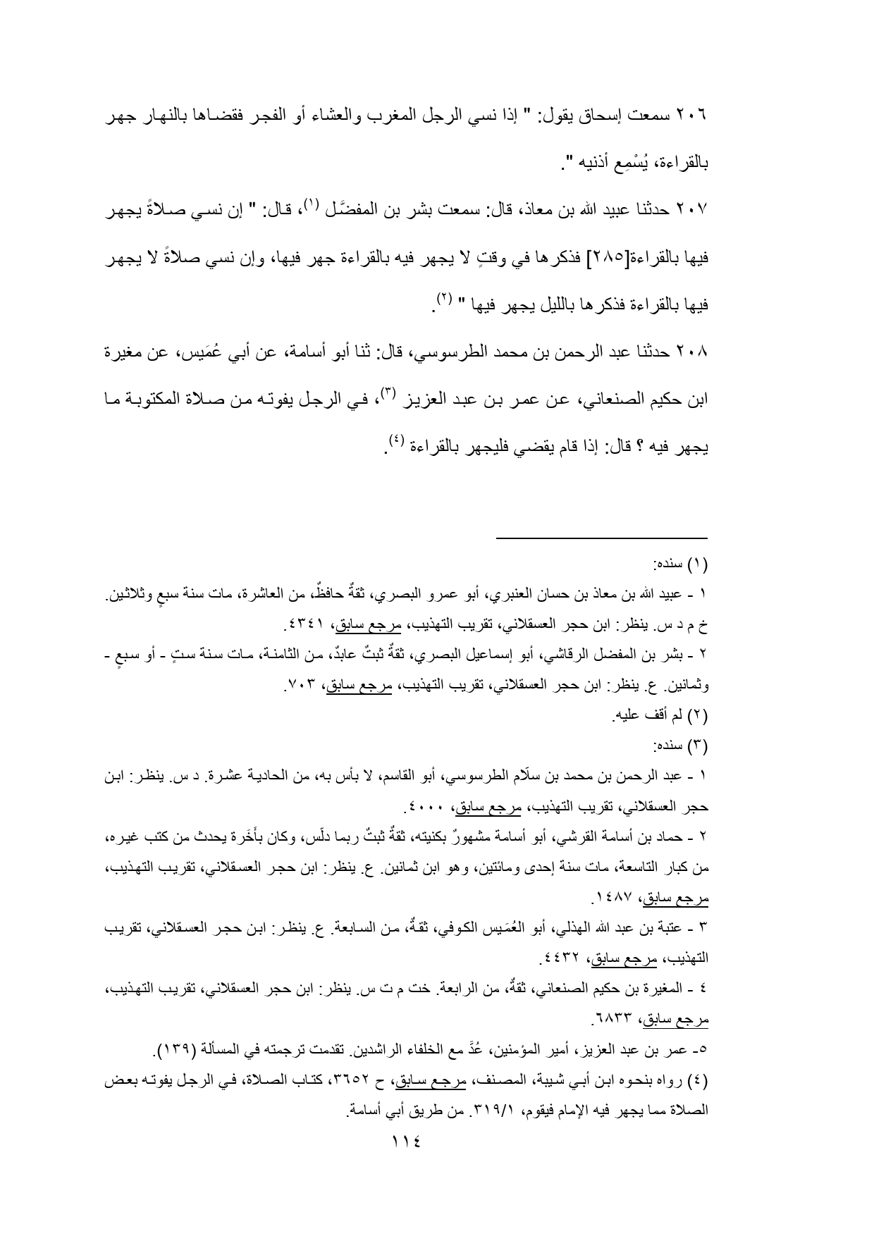 208 - حدثنا عبد الرحمن بن محمد الطرسوسي، قال: ثنا أبو أسامة، عن أبي عُمَيس، عن مغيرة ابن حكيم الصنعاني، عن عمر بن عبد العزيز (¬3)، في الرجل يفوته من صلاة المكتوبة ما يجهر فيه؟ قال: إذا قام يقضي فليجهر بالقراءة (¬4).