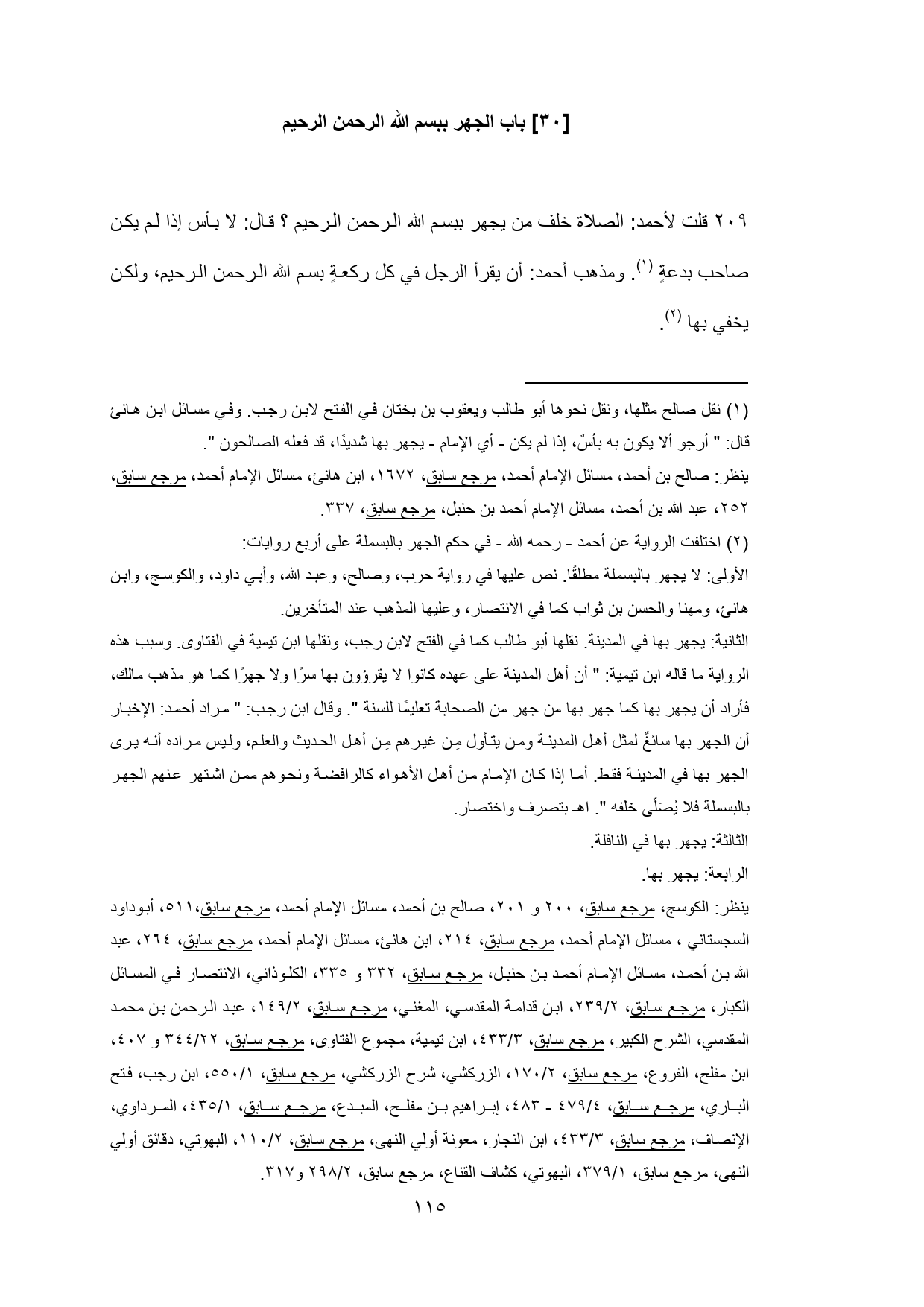209 - قلت لأحمد: الصلاة خلف من يجهر ببسم الله الرحمن الرحيم؟ قال: لا بأس إذا لم يكن صاحب بدعةٍ (¬1). ومذهب أحمد: أن يقرأ الرجل في كل ركعةٍ بسم الله الرحمن الرحيم، ولكن يخفي بها (¬2).