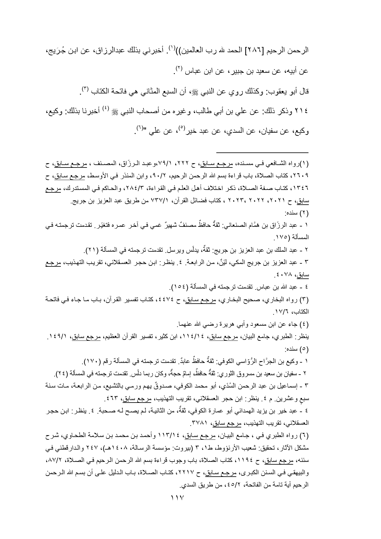 (¬6) رواه الطبري في , جامع البيان، مرجع سابق، 14/ 113 وأحمد بن محمد بن سلامة الطحاوي، شرح مشكل الآثار، تحقيق: شعيب الأرنؤوط، ط 1، 3 (بيروت: مؤسسة الرسالة، 1408 هـ)، 247 والدارقطني في سننه، مرجع سابق، ح 1194، كتاب الصلاة، باب وجوب قراءة بسم الله الرحمن الرحيم في الصلاة، 2/ 87، والبيهقي في السنن الكبرى، مرجع سابق، ح 2217، كتاب الصلاة، باب الدليل على أن بسم الله الرحمن الرحيم آية تامة من الفاتحة، 2/ 45، من طريق السدي.