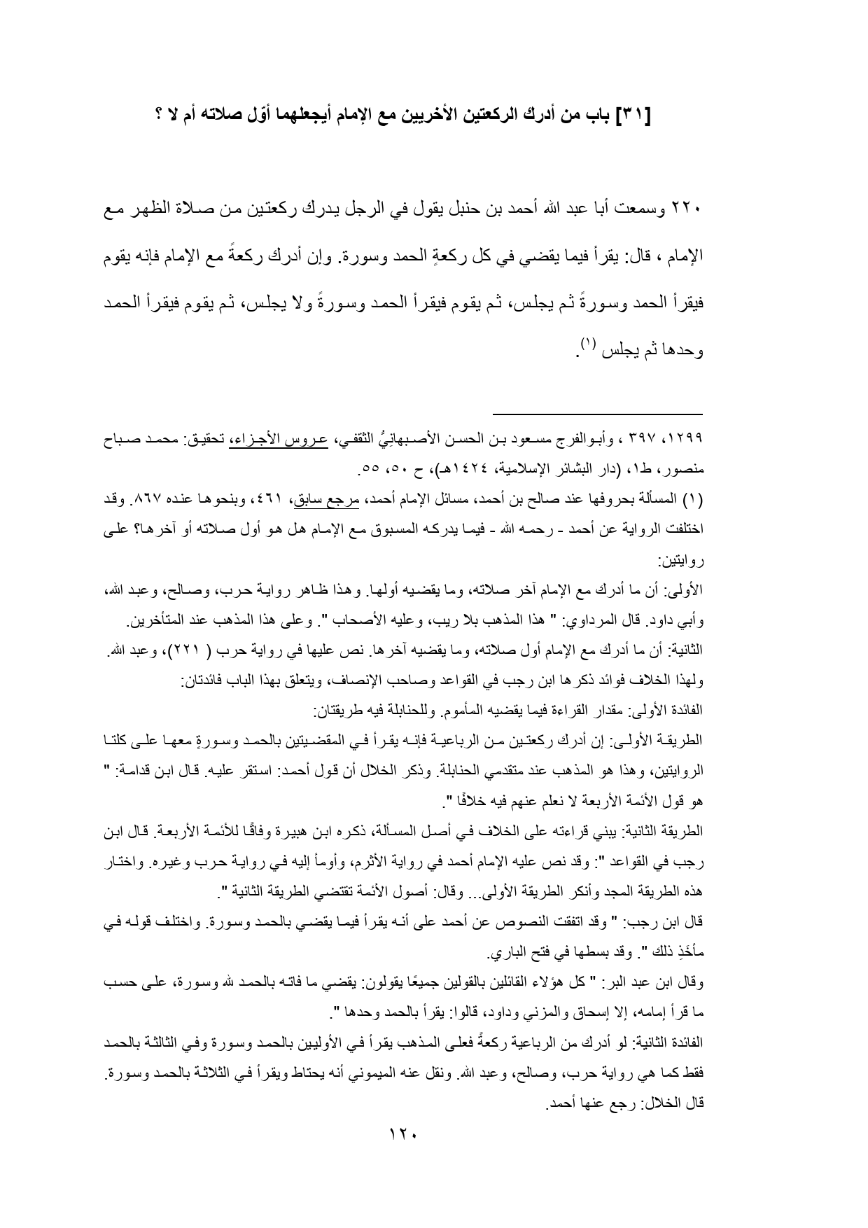 (¬1) المسألة بحروفها عند صالح بن أحمد، مسائل الإمام أحمد، مرجع سابق، 461، وبنحوها عنده 867. وقد اختلفت الرواية عن أحمد - رحمه الله - فيما يدركه المسبوق مع الإمام هل هو أول صلاته أو آخرها؟ على روايتين: