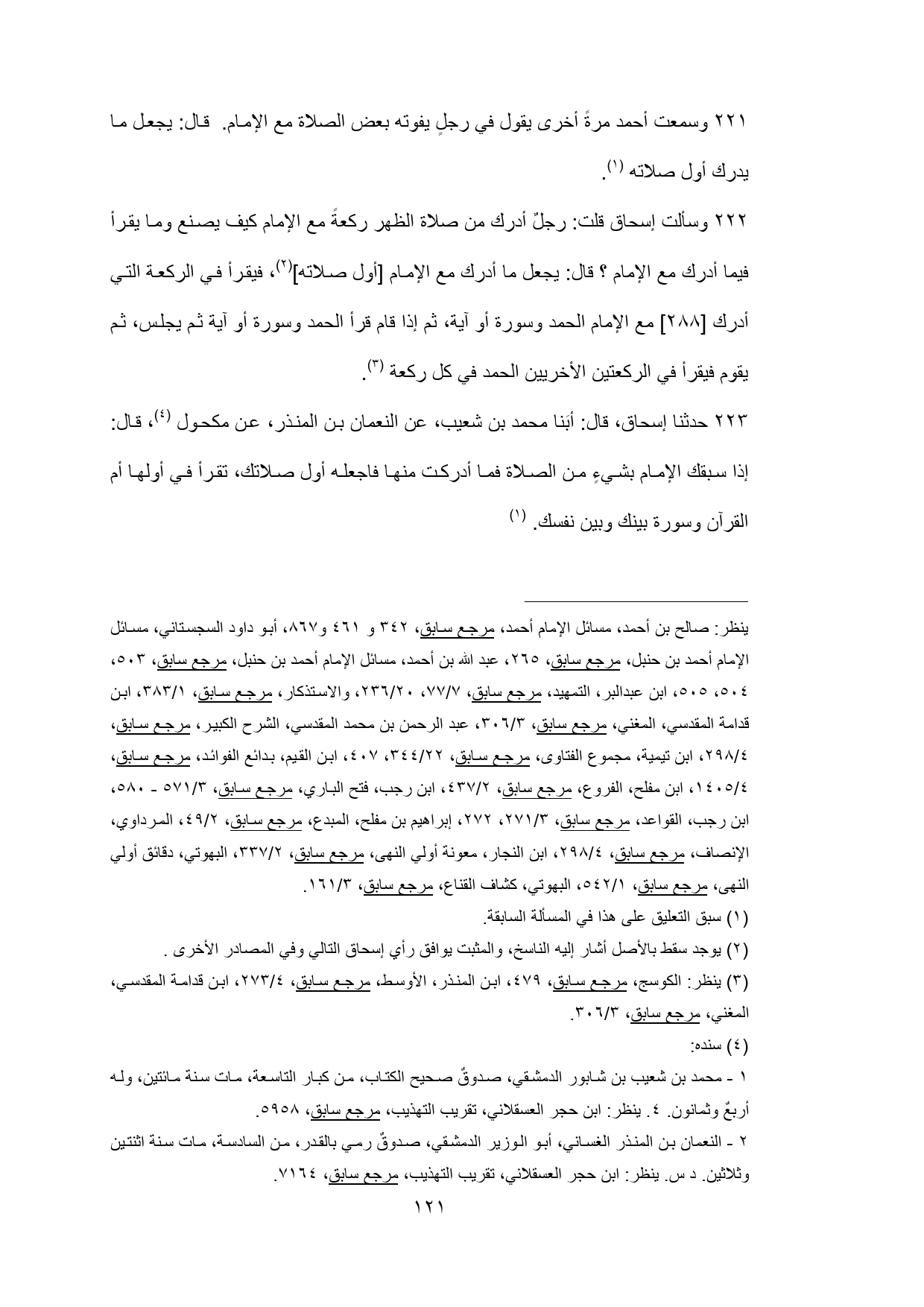 222 - وسألت إسحاق قلت: رجلٌ أدرك من صلاة الظهر ركعةً مع الإمام كيف يصنع وما يقرأ فيما أدرك مع الإمام؟ قال: يجعل ما أدرك مع الإمام [أول صلاته] (¬2)، فيقرأ في الركعة