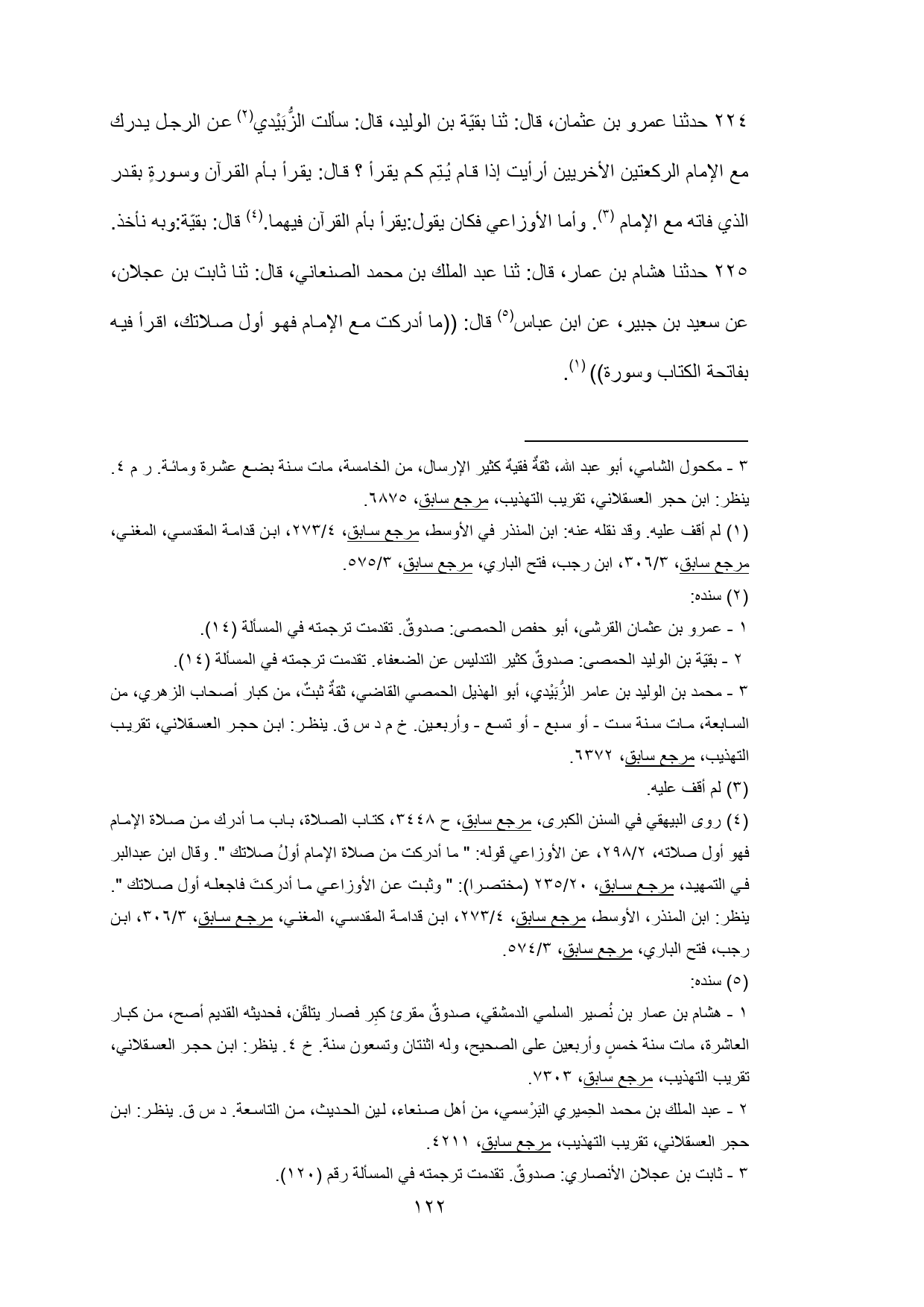 224 - حدثنا عمرو بن عثمان، قال: ثنا بقيّة بن الوليد، قال: سألت الزُّبَيْدي (¬1) عن الرجل يدرك مع الإمام الركعتين الأخريين أرأيت إذا قام يُتِم كم يقرأ؟ قال: يقرأ بأم القرآن وسورةٍ بقدر الذي فاته مع الإمام (¬2). وأما الأوزاعي فكان يقول: يقرأ بأم القرآن فيهما. (¬3) قال: بقيّة: وبه نأخذ.
