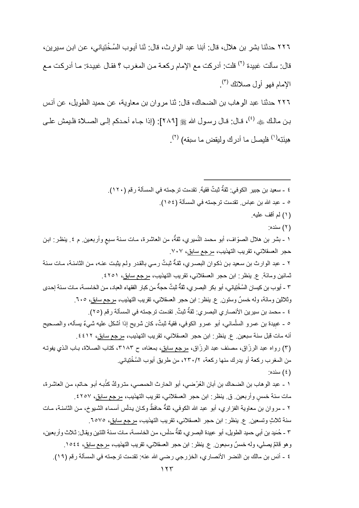 1 - بشر بن هلال الصوّاف، أبو محمد النُميري، ثقةٌ، من العاشرة، مات سنة سبعٍ وأربعين. م 4. ينظر: ابن حجر العسقلاني، تقريب التهذيب، مرجع سابق، 707.