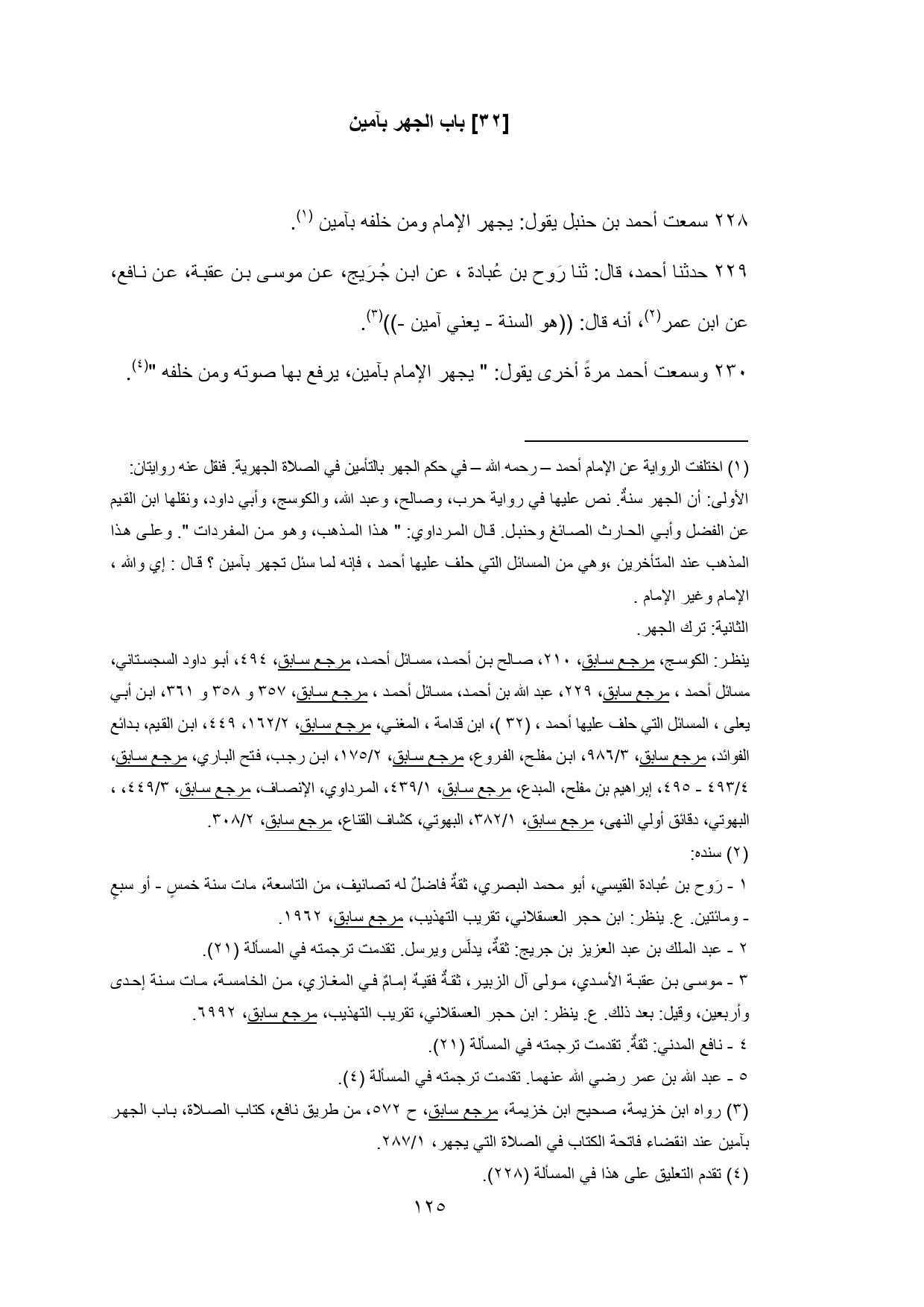 228 - سمعت أحمد بن حنبل يقول: يجهر الإمام ومن خلفه بآمين (¬1).