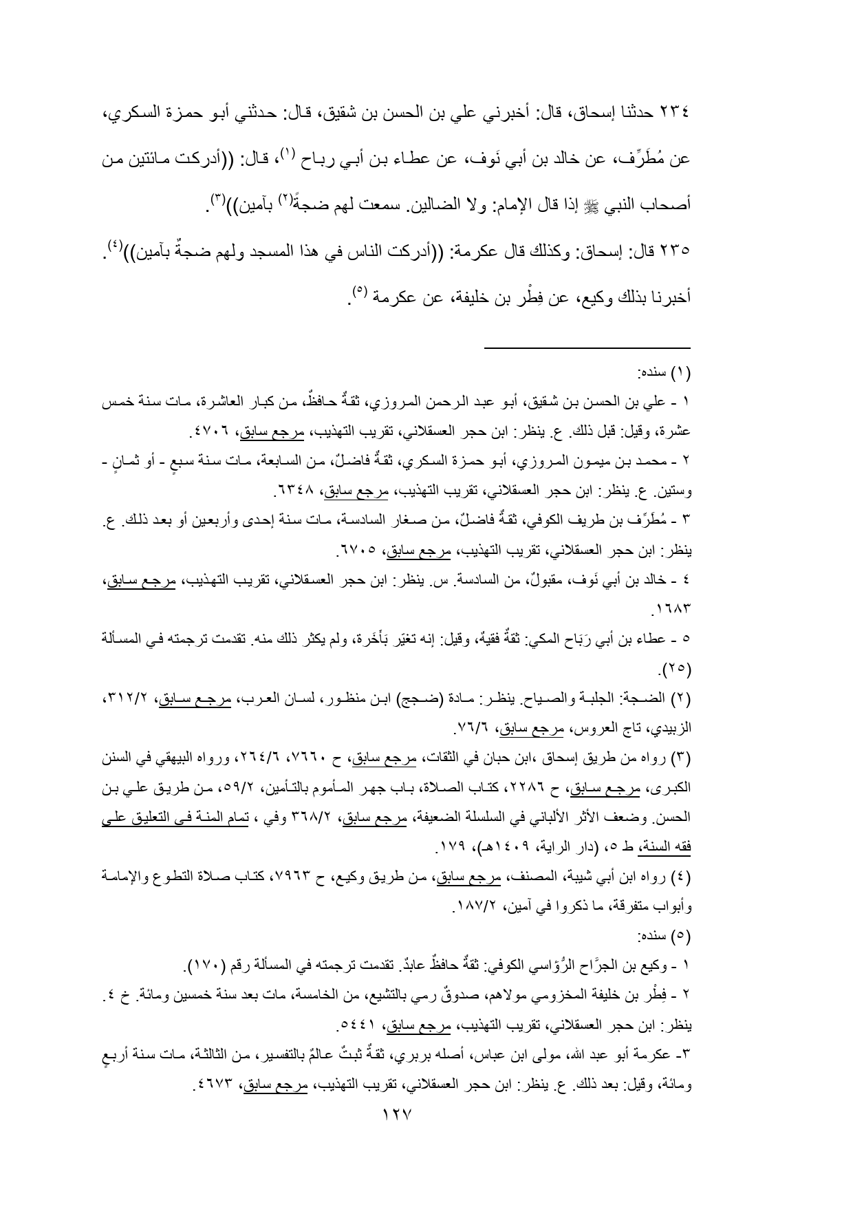 (¬3) رواه من طريق إسحاق ,ابن حبان في الثقات، مرجع سابق، ح 7660، 6/ 264، ورواه البيهقي في السنن الكبرى، مرجع سابق، ح 2286، كتاب الصلاة، باب جهر المأموم بالتأمين، 2/ 59، من طريق علي بن الحسن. وضعف الأثر الألباني في السلسلة الضعيفة، مرجع سابق، 2/ 368 وفي، تمام المنة في التعليق على فقه السنة، ط 5، (دار الراية، 1409 هـ)، 179.