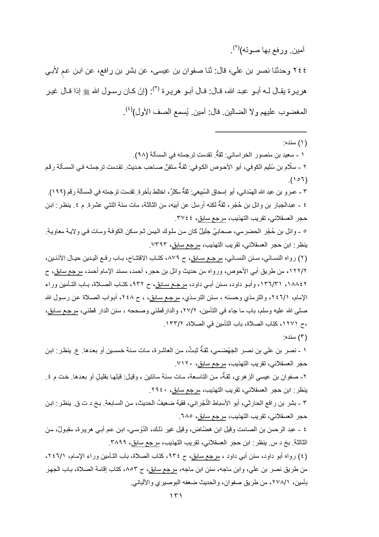 244 - وحدثنا نصر بن علي، قال: ثنا صفوان بن عيسى، عن بشر بن رافع، عن ابن عمٍ لأبي هريرة يقال له أبو عبد الله، قال: قال أبو هريرة (¬2): (إنْ كان رسول الله - صلى الله عليه وسلم - إذا قال غير المغضوب عليهم ولا الضالين. قال: آمين. يُسمع الصف الأول) (¬3).