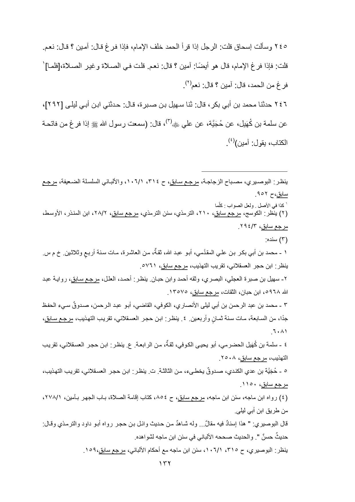 245 - وسألت إسحاق قلت: الرجل إذا قرأ الحمد خلف الإمام، فإذا فرغ قال: آمين؟ قال: نعم. قلت: فإذا فرغ الإمام، قال هو أيضًا: آمين؟ قال: نعم. قلت في الصلاة وغير الصلاة، [فلما] (¬1) فرغ من الحمد، قال: آمين؟ قال: نعم (¬2).