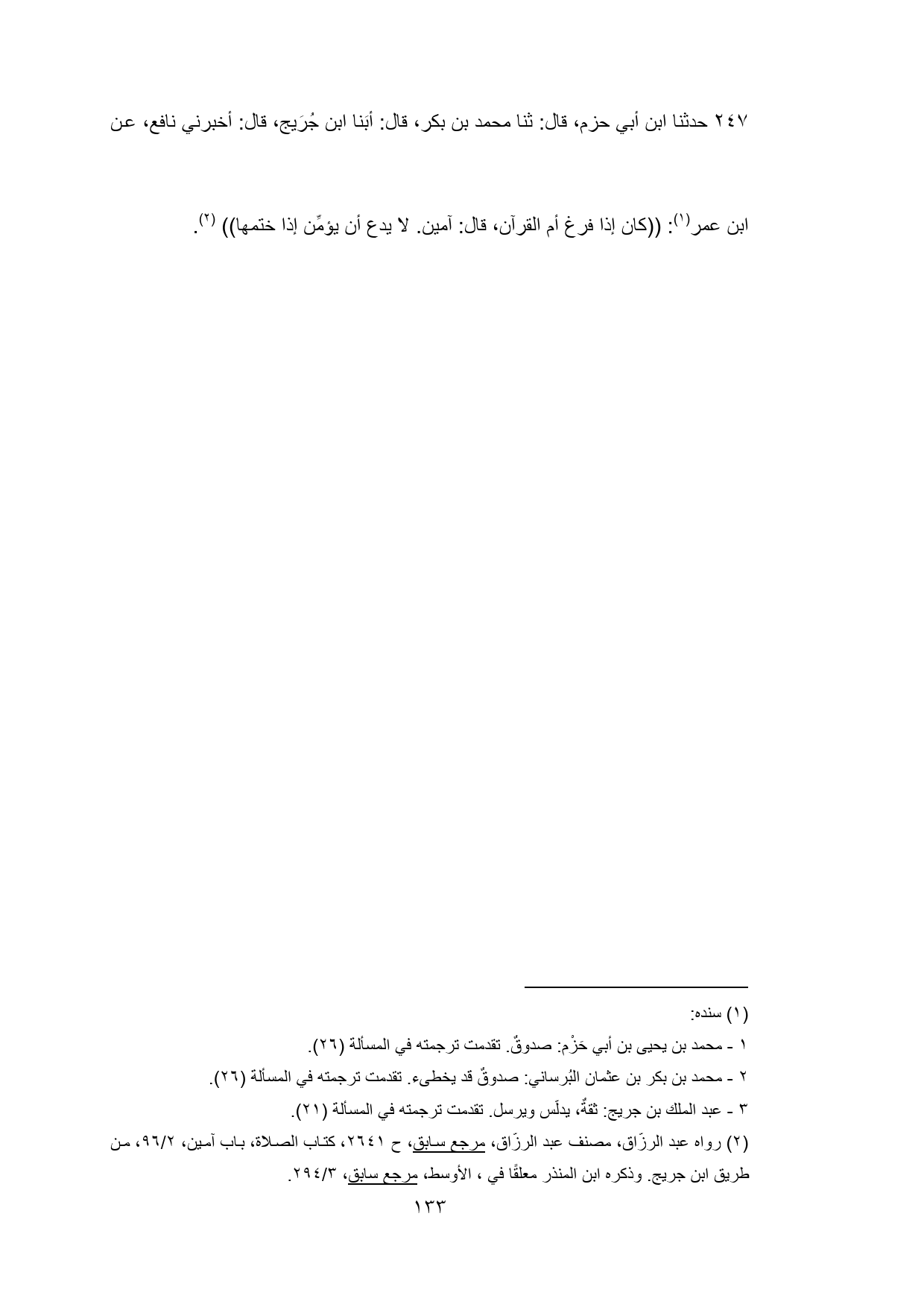 247 - حدثنا ابن أبي حزم، قال: ثنا محمد بن بكر، قال: أبَنا ابن جُرَيج، قال: أخبرني نافع، عن