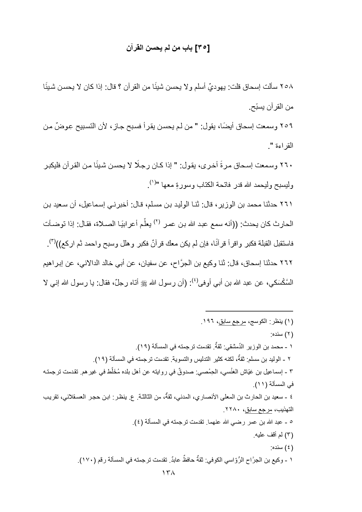 258 - سألت إسحاق قلت: يهوديٌ أسلم ولا يحسن شيئًا من القرآن؟ قال: إذا كان لا يحسن شيئًا من القرآن يسبّح.