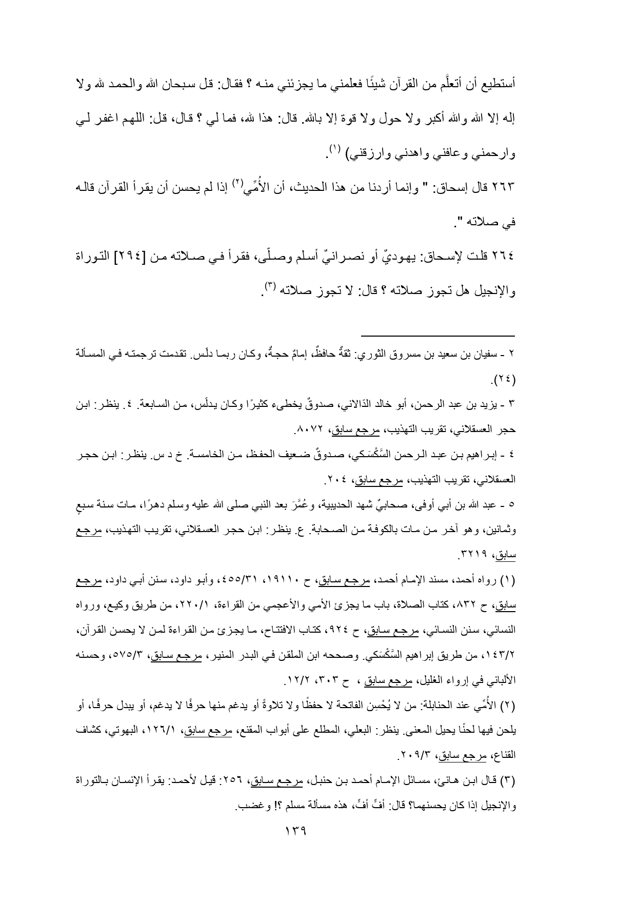 264 - قلت لإسحاق: يهوديٌ أو نصرانيٌ أسلم وصلّى، فقرأ في صلاته من [294] التوراة والإنجيل هل تجوز صلاته؟ قال: لا تجوز صلاته (¬3).