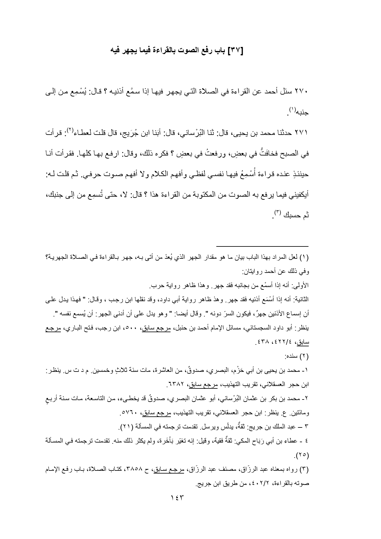 271 - حدثنا محمد بن يحيى، قال: ثنا البُرْساني، قال: أبَنا ابن جُرَيج، قال قلت لعطاء (¬2): قرأت في الصبح فخافَتُّ في بعضٍ، ورفعتُ في بعضٍ؟ فكره ذلك، وقال: ارفع بها كلها. فقرأت أنا حينئذٍ عنده قراءة أُسْمِعُ فيها نفسي لفظي وأفهم الكلام ولا أفهم صوت حرفي. ثم قلت له: أيكفيني فيما يرفع به الصوت من المكتوبة من القراءة هذا؟ قال: لا، حتى تُسمِع من إلى جنبك، ثم حسبك (¬3).