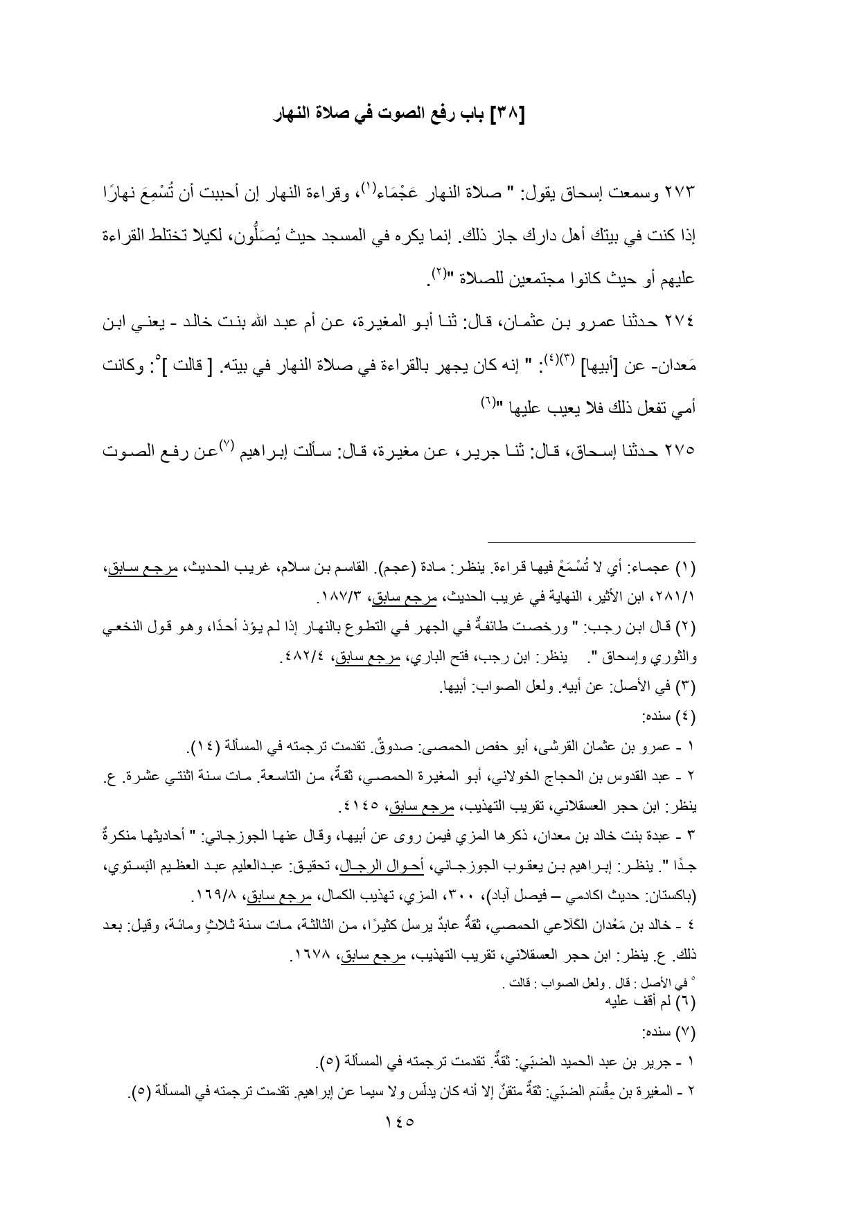 273 - وسمعت إسحاق يقول: " صلاة النهار عَجْمَاء (¬1) , وقراءة النهار إن أحببت أن تُسْمِعَ نهارًا إذا كنت في بيتك أهل دارك جاز ذلك. إنما يكره في المسجد حيث يُصَلُّون، لكيلا تختلط القراءة عليهم أو حيث كانوا مجتمعين للصلاة " (¬2).